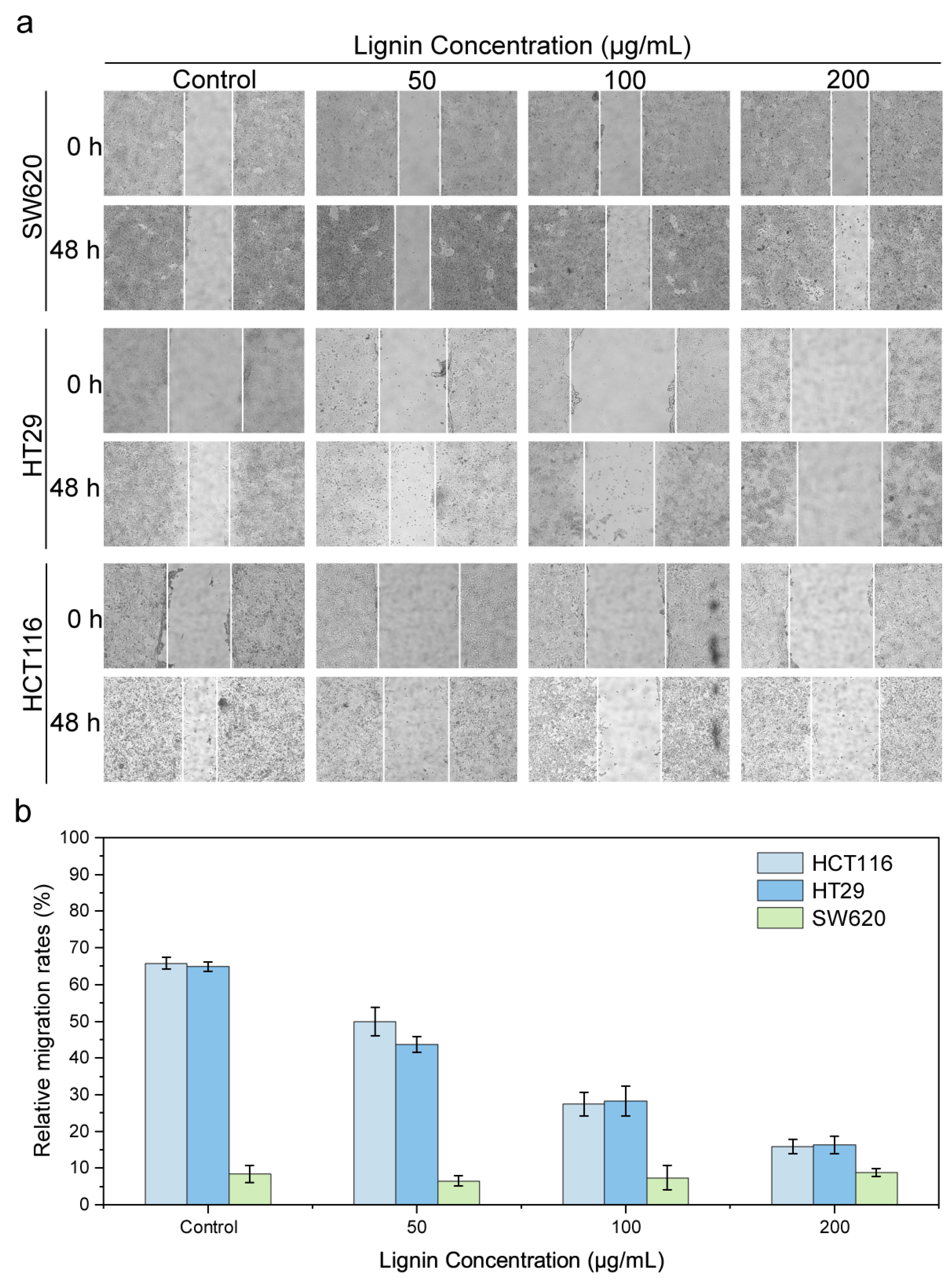 In the present study, the influence of coffee grounds-derived lignin nanoparticles (CLN) on the migratory potential of three colorectal cancer (CRC) cell lines (SW620, HT29, HCT116) was systematically assessed via cell scratch assay. As illustrated in