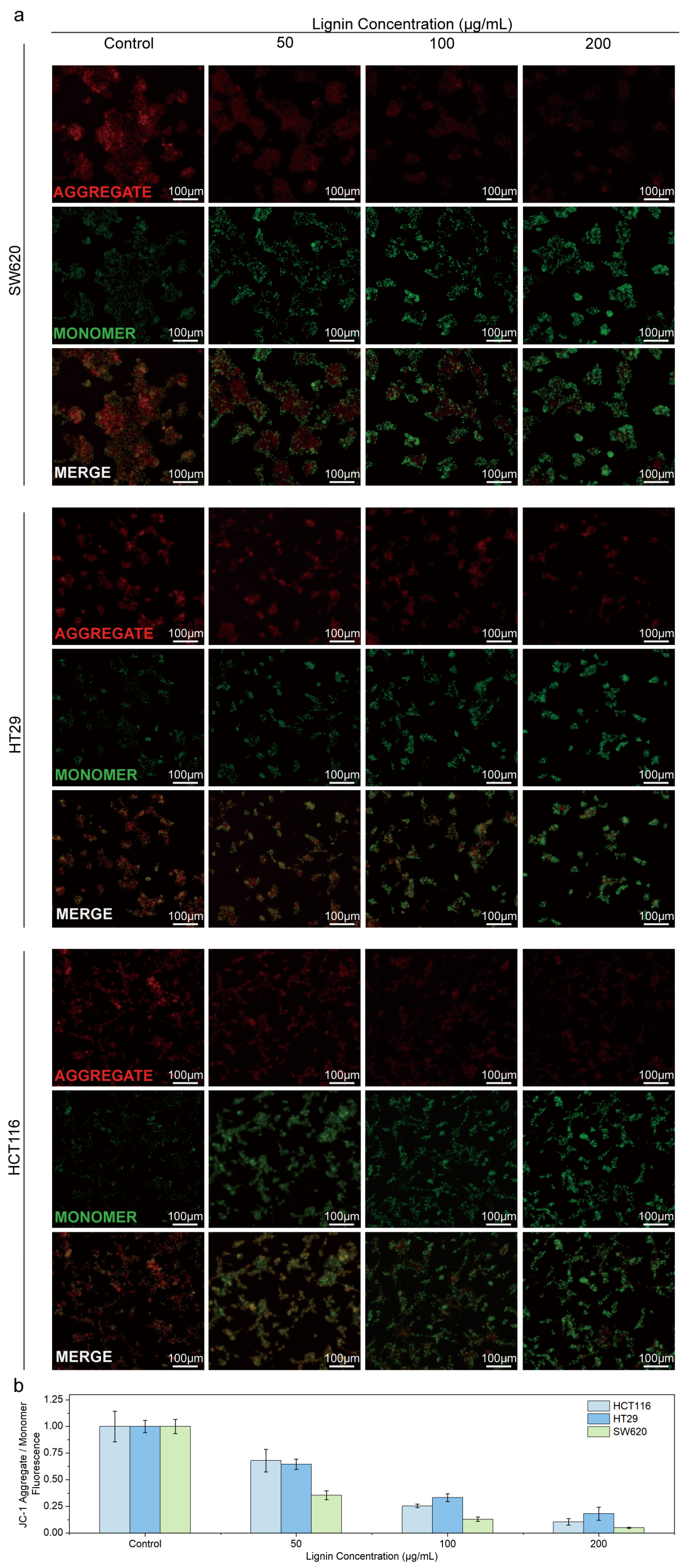 To clarify whether CLN induces apoptosis in CRC cells by interfering with mitochondrial function, the present study investigated the effect of CLN on the mitochondrial membrane potential (MMP) of CRC cell lines (HCT116, HT29, SW620) via JC-1 staining combined with fluorescence imaging and quantitative analysis.