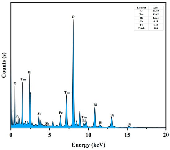 The microstructure of the BTBTHP was investigated by using the transmission electron microscopy (TEM); simultaneously, the elemental composition content and the elemental qualitative judgment of the BTBTHP were determined by using the energy dispersive X-ray spectrometer (EDS) (Thermo Fisher Scientific, Waltham, MA, USA). Figure 2a displays the TEM morphology image of the BTBTHP. Figure 2b displays the high-resolution transmission electron microscopy (HRTEM) image of the BTBTHP. In order to better reveal the microstructure of the BTBTHP composite sample, two additional TEM and HRTEM images have been provided, as shown in Figures S9 and S10. Figure 3 shows the EDS elemental scanning map of the BTBTHP. It can be found from Figure 2a that the TEM morphology image of the BTBTHP explicitly described the presence of the BiTmFeSbO7 nanoparticle and the BiTmO3 nanoparticle which belonged to the BTBTHP. Additionally, the HRTEM stripe image of the interface between the BiTmFeSbO7 nanoparticle and the BiTmO3 nanoparticle which were marked in Figure 2a can be found from Figure 2b. As a result, the lattice plane spacing d value of 0.305 nm corresponded to the crystal plane index of (222) for the BiTmFeSbO7 photocatalyst, and the lattice plane spacing d value of 0.312 nm corresponded to the crystal plane index of (111) for the BiTmO3 photocatalyst. The close interfacial contact between the BiTmFeSbO7 photocatalyst and the BiTmO3 photocatalyst was emphasized, clearly confirming that the coexistence of the BiTmFeSbO7 photocatalyst and the BiTmO3 photocatalyst was realized in the prepared heterojunction catalyst BTBTHP. The results presented in Figure 3 indicated that the larger particles contained Bi element, Tm element, Fe element, Sb element, and O element. Conversely, the smaller particles did not contain Fe element and Sb element; however, the smaller particles contained Bi element, Tm element, and O element. In accordance with the above analysis, we could draw a conclusion that the larger particles corresponded to the BiTmFeSbO7 photocatalyst while the smaller particles corresponded to the BiTmO3 photocatalyst. Additionally, Figure 4 displays the EDS spectrum of the BTBTHP. The EDS spectrum which is shown in Figure 4 indicated that the atomic ratio of the Bi element, Tm element, Fe element, Sb element, and O element which were contained in the BTBTHP was approximately 1235:1362:611:613:6179. Based on the above comprehensive results, it could be convincingly concluded that the high-purity BTBTHP was successfully synthesized under the specified preparation parameters.