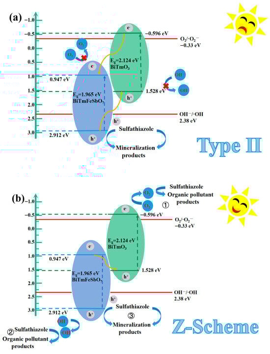 According to the above insights, a suitable energy band structure should be designed; thus, we propose a novel direct Z-scheme BiTmFeSbO7/BiTmO3 heterojunction photocatalyst (BTBTHP) for the efficient degradation of the STZ under the condition of VLIRN. The innovative research content of this study is the successful preparation of new visible light responsive BiTmFeSbO7 photocatalysts, the BiTmO3 photocatalyst and the BTBTHP, by using the solvothermal method. This study investigates the photocatalytic degradation efficiency of the STZ by using the BTBTHP, the BiTmFeSbO7 photocatalyst, the BiTmO3 photocatalyst, and the nitrogen-doped TiO2 (N-T) under the condition of VLIRN. The photocatalytic activity of the BTBTHP, the BiTmFeSbO7 photocatalyst, the BiTmO3 photocatalyst, and the N-T photocatalyst are evaluated. The results showed that the BTBTHP exhibited excellent photocatalytic activity compared with the BiTmFeSbO7 photocatalyst, the BiTmO3 photocatalyst and the nitrogen-doped TiO2 (N-T); meanwhile, the reusability and the stability of the BTBTHP are verified by accomplishing the cyclic experiments. The crystal structure, morphological characteristics, and optical properties of the BTBTHP are thoroughly investigated; concurrently, the possible direct Z-scheme mechanism of the BTBTHP is verified. This study systematically explores the types of radicals, the reaction mechanisms, and the degradation pathways during the photocatalytic degradation process of the STZ. This research provides important process parameters and a theoretical basis for developing an environmentally friendly photocatalytic reaction system which can degrade the STZ efficiently in pharmaceutical wastewater.