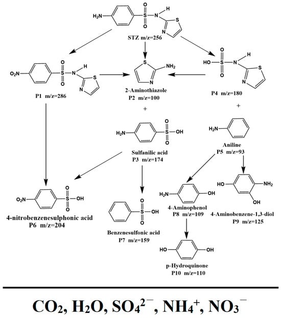 Antibiotics are a class of compounds which are produced by microorganisms or synthesized artificially through chemical methods []. Antibiotics are used to treat microbial infectious diseases and are widely applied in human healthcare, agriculture, animal husbandry, and aquaculture [,]. Sulfonamide antibiotics are prolonged synthetic antibiotics which have been utilized for a long time in history. Sulfonamide antibiotics possess broad-spectrum antibacterial activity, significant therapeutic effects, stable properties, and low cost characteristic; thus, sulfonamide antibiotics have become one of the most extensively applied antibiotics []. The sulfathiazole (STZ) is one of the most extensively applied sulfonamide antibiotics and has a high detection rate within the aquatic environments. Notably, the STZ cannot be completely metabolized and absorbed within the human and animal bodies. The unabsorbed STZ enters the environment via wastewater discharge in the form of the parent drug or its metabolites, leading to water resource pollution []. Numerous studies indicated that the STZ possessed high stability, biological toxicity, water solubility, and strong migration capability []. The high mobility of the STZ facilitates its extensive dispersion through water circulation systems; as a result, the STZ is frequently detected in surface waters [,] with a concentration of μg/L level [,]. The STZ resists the effective removal by using the conventional wastewater treatment systems due to the anionic character and difficult biodegradation characteristic []. The accumulating burden of the STZ progressively heightens the potential risks to the organism, including the acute toxicity and the chronic toxicity; concurrently, the microbiologic population undergoes serious threat []. The prolonged existence of the STZ which is obtained in the environment facilitates the STZ for going into the food chain; ultimately, human health and animal health are affected []. Therefore, developing an efficient and clean method for removing the residual STZ from water bodies is an urgent problem which should be solved.