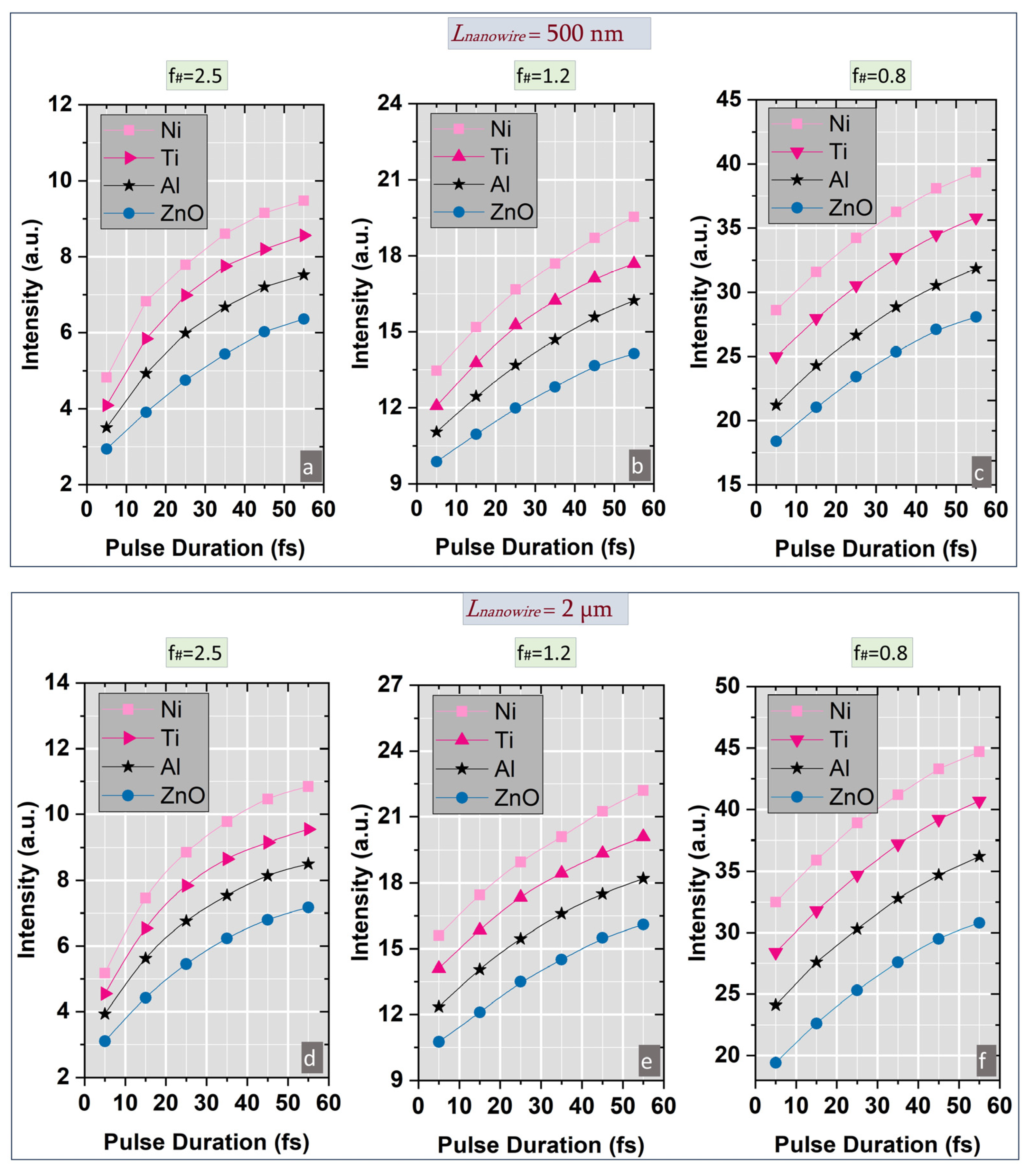 A detailed investigation of the laser field intensity dynamics in the vicinity of the focal point was performed as a function of pulse duration for each f# value and for the optimized nanowires dimensions previously determined. Compared to the case of nanostructured conical targets, additional studies reveal that the microstructured targets produced intensity values approximately twice as high as those of the unstructured surfaces. Among the current materials analysis, Ni exhibited the highest intensity enhancement for all three numerical apertures and for all pulse durations values (Figure 2a–i). By extending the numerical analysis to the extreme values of the nanowire’s length range (500 nm and 3 µm, respectively), we observe a general decrease in intensity values of approximately 12% for Lnanowire = 500 nm and 15% for Lnanowire = 3 µm for all f# values compared to the optimum case of Lnanowire = 2 µm. For particular case of Lnanowire = 2 µm, it was observed that Ni produced approximately two times greater intensity values than those obtained for ZnO over the pulse duration range. Overall, a similar trend in intensity evolution with the pulse duration was observed for all four target materials under equivalent input conditions. For a constant emitted energy, the laser field intensity in the focal spot was higher for the 90 µm beam than for the 30 µm and 60 µm beams, owing to the influence of the numerical aperture on the focusing of the peripheral and paraxial rays after lens propagation (Figure 3a). For all three f# values, the laser intensity increased monotonically with the chromatic dispersion (dn/dλ) of the target material, underscoring the role of the dispersion in the field enhancement process. Consequently, nickel, possessing the highest chromatic dispersion value, yields the most intense field value.
