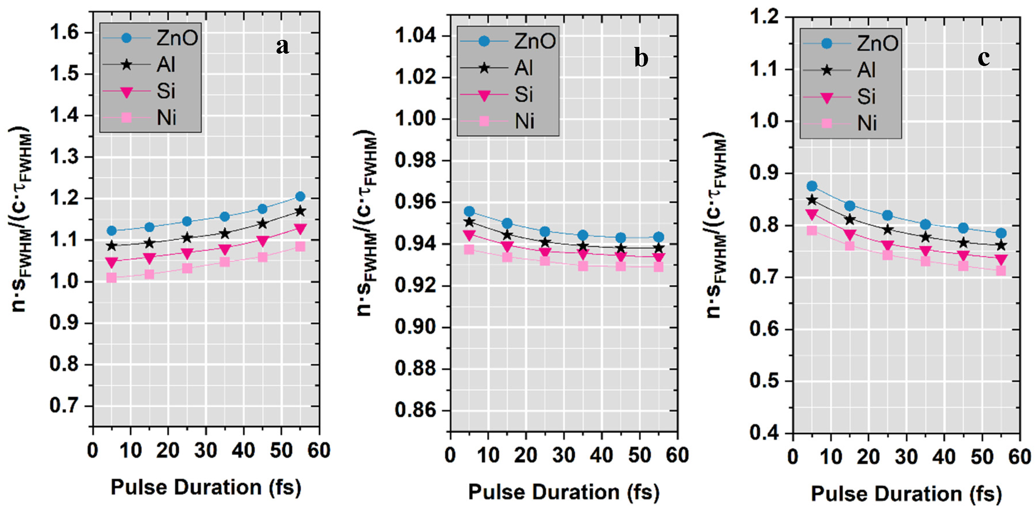 The results reveal that the temporal FWHM variations correspond directly to the spectral broadening of the laser pulse. The numerical results further presented reveal that the highest ratio between spatial and temporal FWHM occurred for Ni, for all three f# cases under pulse duration variation.