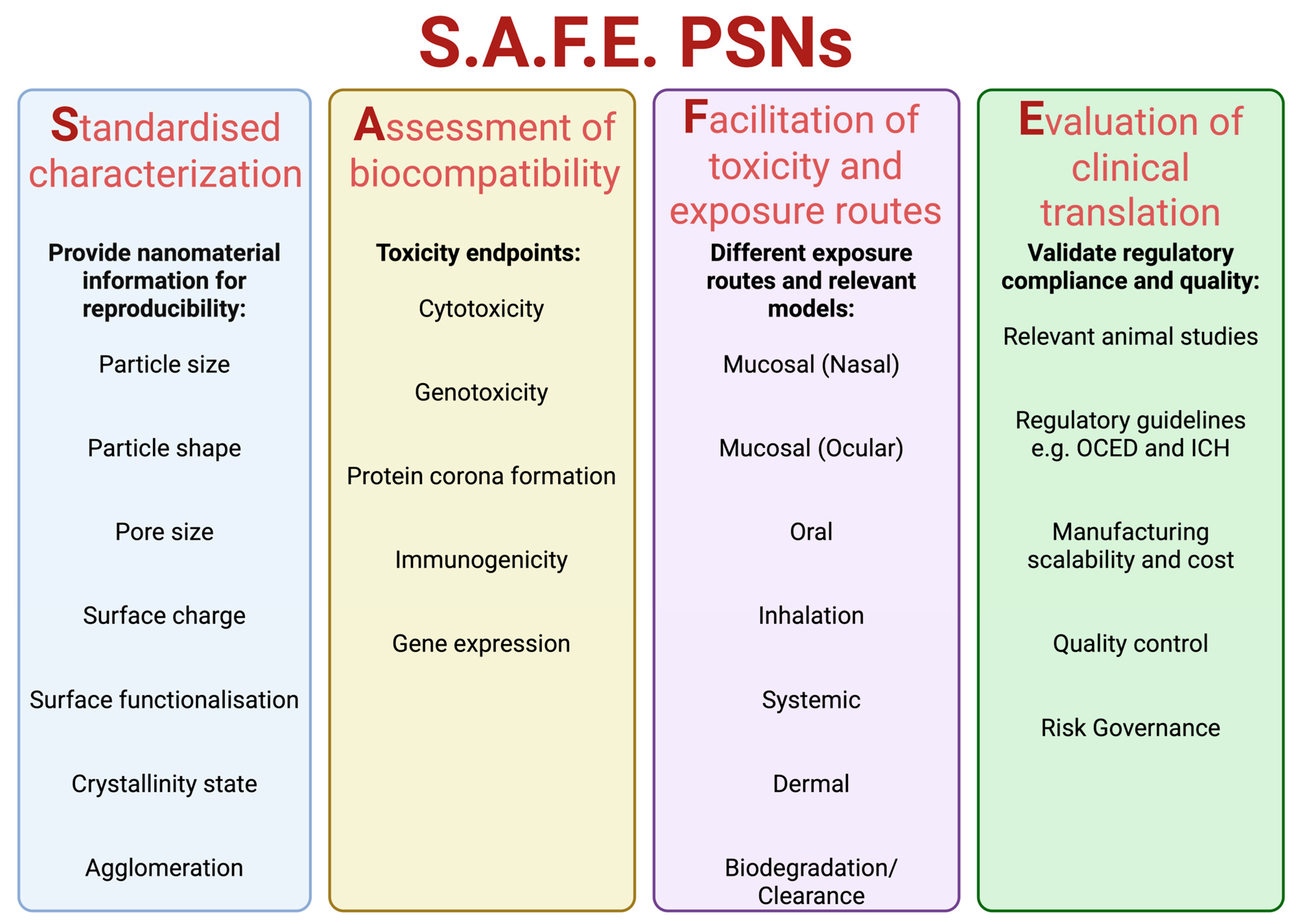 | Standardisation and Regulatory Challenges | Are regulatory and standardisation frameworks sufficient for PSN translation? How can PSNs be integrated into regulatory frameworks for medical devices or drug formulation? | Regulatory guidance exists for some advanced nanomaterials, but not specifically for PSNs. Standardised characterisation, dissolution testing, toxicity endpoints and manufacturing methods need to be established to meet clinical trial requirements. |