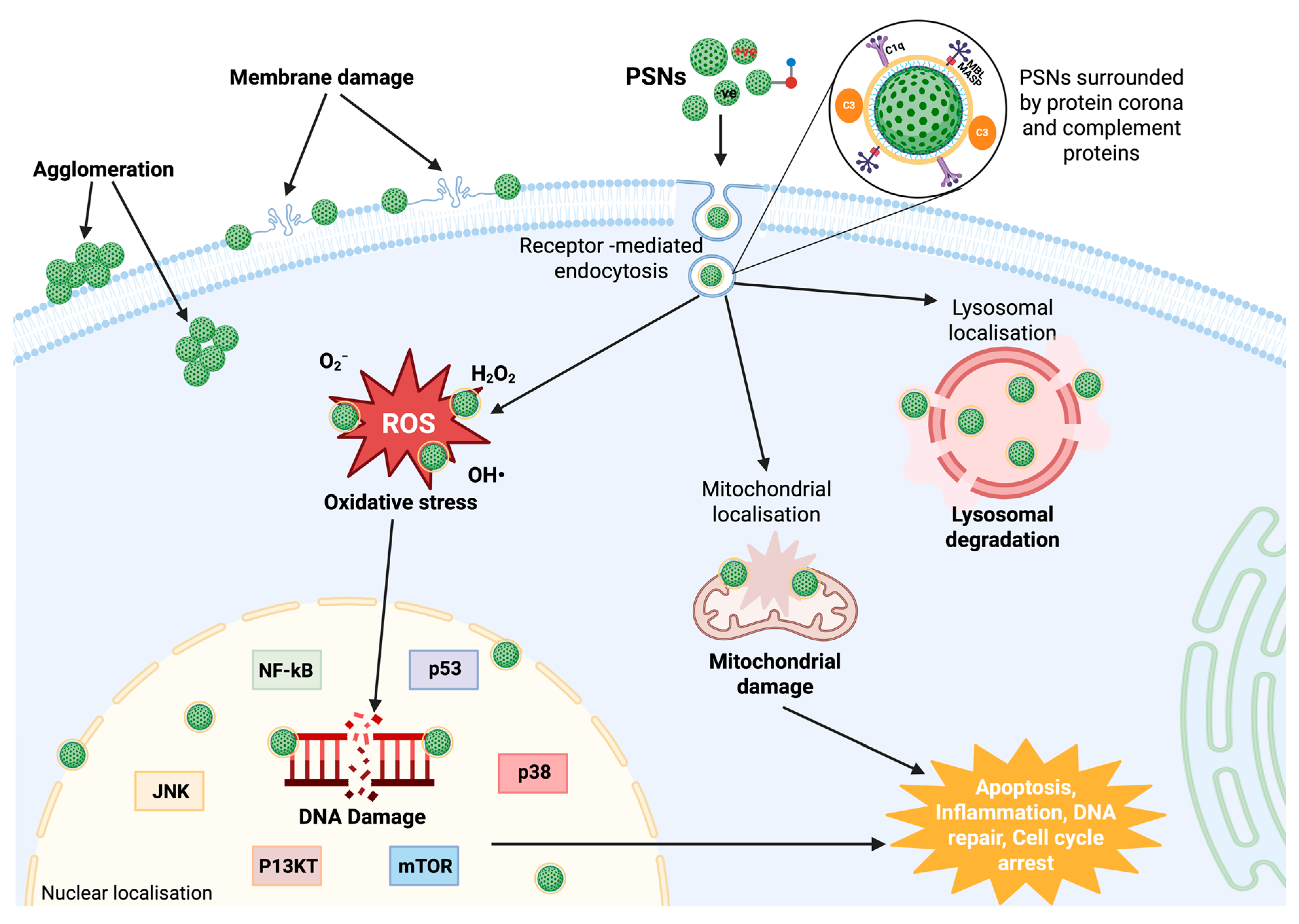 | How do PSNs and their protein corona influence immunogenicity and potential immunotoxicity? | PSNs may activate the complement system or cytokine release depending on their physicochemical properties. However, comprehensive immunotoxicity studies of PSNs are limited. Standardised immune assays and long-term models are needed to clarify chronic immune effects and safety. | |
