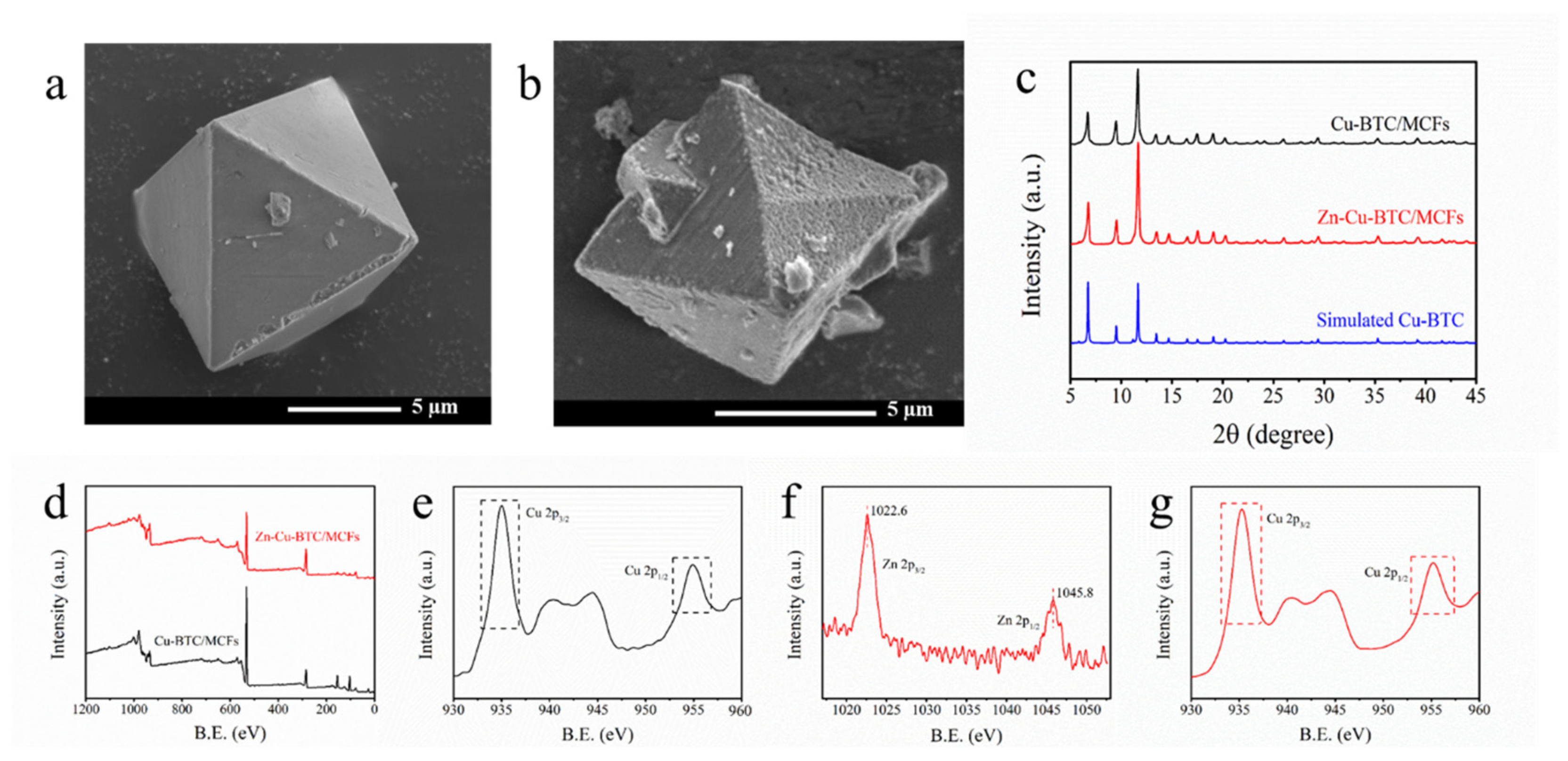 3.1. Characterizations of Zn-Cu-BTC/MCFs