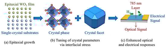 The crystal phase and exposed crystal facets of oxide epitaxial films can be precisely manipulated through the selection of single-crystal substrates with specific types and orientations, thereby providing ideal experimental platforms to investigate the influence of crystal phase and facet exposure on gas sensing performance [30]. Prior studies have successfully fabricated epitaxial WO3 thin films exhibiting single exposed crystal facets in tetragonal [31,32], monoclinic [32], and hexagonal phases [33] on various substrates. Furthermore, oxide epitaxial films offer advantages such as controllable vertical grain size, and excellent thermal stability, rendering them highly promising candidates for gas sensing applications. WO3 is particularly well-suited for studies on crystal phase and facet regulation due to its six distinct crystal phase transitions occurring between −100 °C and 1000 °C [34,35]: monoclinic (Pc, <−55 °C), triclinic ( P 1 ¯ , −55 to 15 °C), monoclinic (P21/n, 15 to 350 °C), orthorhombic (Pmnb, 350 to 720 °C), monoclinic (P21/c, 720 to 800 °C), tetragonal (P4/ncc, 800 to 900 °C), and tetragonal (P4/nmm, >900 °C). Additionally, a hexagonal phase of WO3 exists, and at ambient temperature, WO3 may exhibit coexistence of triclinic and monoclinic phases. Although the complexity of these crystal structures poses challenges for the preparation of specific phases, it simultaneously affords greater flexibility for tuning gas sensing properties. From a crystallographic perspective, the phase transitions in WO3 fundamentally involve distortion and tilting of WO6 octahedra [31]. Consequently, by selecting different single-crystal substrates, interfacial stress between the epitaxial film and substrate can be exploited to modulate the distortion and tilting of WO6 octahedra, enabling the stabilization of metastable phases absent at room temperature and thereby achieving novel gas sensing performance. Concurrently, the orientation of the single-crystal substrate can be utilized to control the exposed crystal facets of WO3 films. In this study, laser molecular beam epitaxy (Laser-MBE) is employed to synthesize WO3 thin films with tailored crystal phases and exposed facets on single-crystal substrates of varying orientations and lattice constants, with the objective of elucidating the effects of crystal phase and facet exposure on the optical and electrical hydrogen sensing properties of WO3 [36].