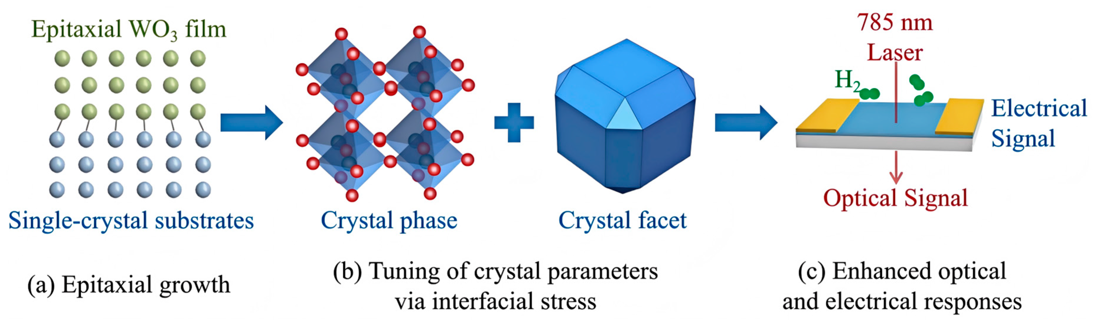 Tungsten trioxide (WO3) exhibits complementary optical and electrical responses toward hydrogen, yet the interplay between interfacial stress, crystal phase stabilization, and gasochromic/chemiresistive performance remains insufficiently understood. In this work, WO3 films were grown on four single-crystal oxide substrates to systematically tune interfacial stress and thereby modulate the resulting crystal phase, microstructure, and exposed facets. θ–2θ diffraction revealed that WO3 adopts a monoclinic phase on YAlO3 and SrLaAlO4, whereas a high-temperature orthorhombic phase is stabilized on LaAlO3 (LAO) and SrTiO3 due to stronger interfacial constraint. Compared with the amorphous quartz reference, the single-crystal substrates significantly enhanced both gasochromic and chemiresistive responses. In particular, the orthorhombic WO3/LAO film exhibited an electrical response of 1.97 × 104 (Rair/RH2), an optical transmittance changed of 12.7%, and an electrical response time of 1 s toward 2% H2 at 80 °C, far exceeding the monoclinic and amorphous counterparts. The combined effects of stress-induced phase stabilization, film orientation, and hydrogen diffusion pathways are shown to govern the non-monotonic sensing trends among different substrates. These findings elucidate the structural origin of hydrogen sensitivity in WO3 and provide guidance for stress-engineered design of high-performance gasochromic and chemiresistive sensors.