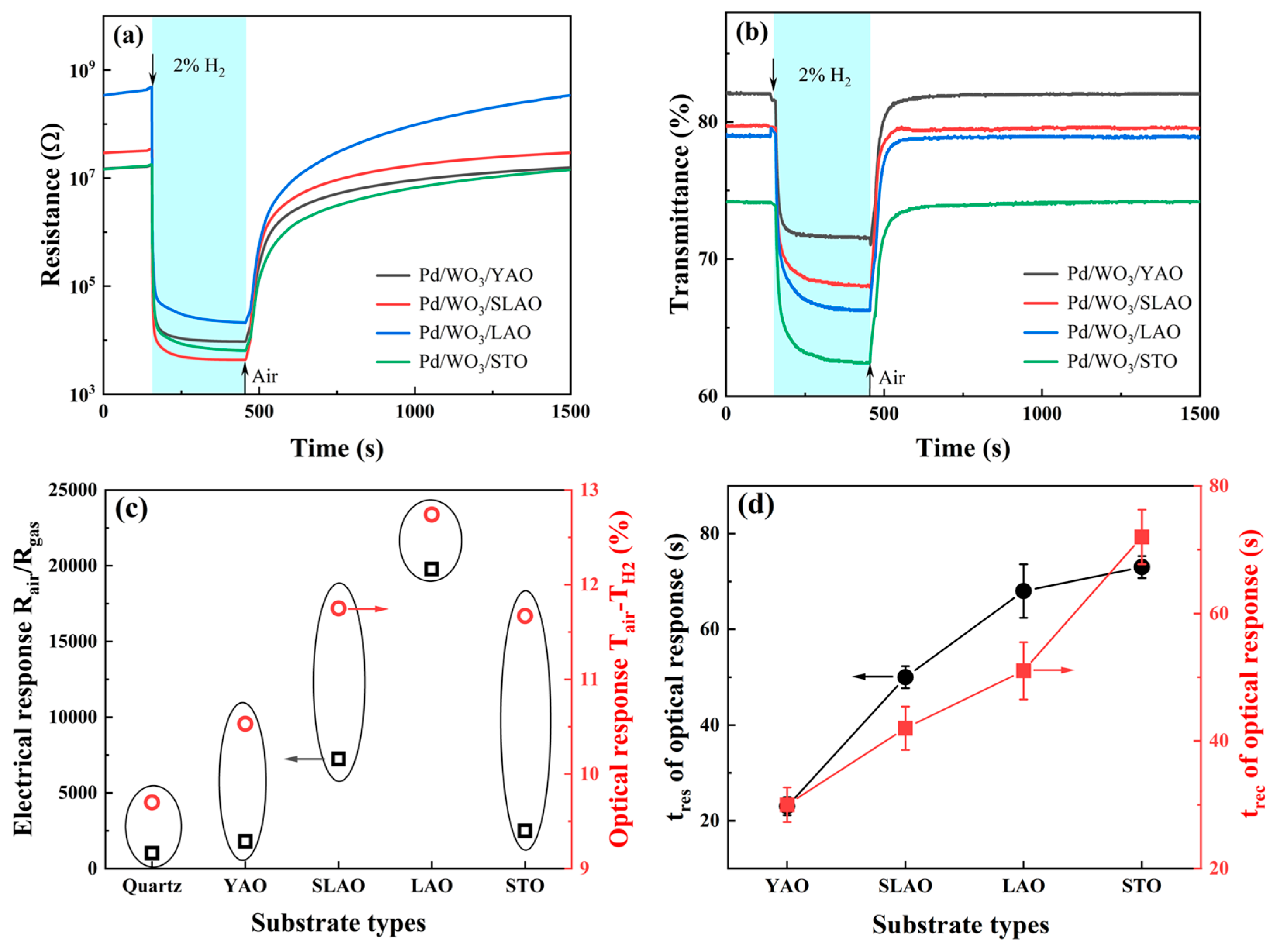 Figure 6. Response curves of WO3 grown on four single-crystal substrates to 2 vol.% hydrogen at an operating temperature of 80 °C: (a) resistance response; (b) transmittance response; (c) response magnitude; (d) optical response and recovery times.