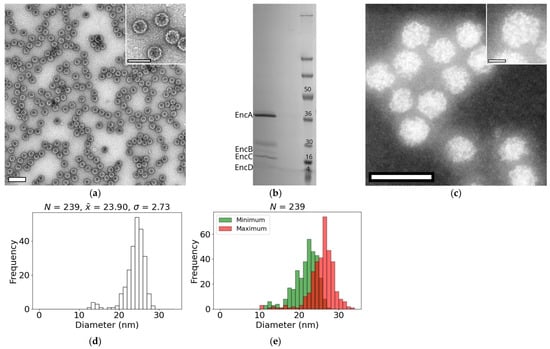 Native encapsulin nanocompartments were successfully isolated from a yellow-pigmented M. xanthus DK1622 wild-type strain. In contrast to previous reports [], the assembled nanocompartments sedimented as a brown pellet at the bottom of the CsCl gradient rather than forming a whitish band near the top of the CsCl cushion. TEM of negatively stained samples revealed highly homogeneous, spherical particles with an average diameter of ~32 nm (Figure 1a), consistent with earlier observations [,]. SDS-PAGE analysis confirmed the nanocompartments are composed of the expected four proteins (Figure 1b): EncA (32 kDa), EncB (17 kDa), EncC (13 kDa) and EncD (11 kDa). Densitometric quantification of the gel bands indicated that each encapsulin shell contains approximately 18 EncB, 61 EncC, and 17 EncD molecules. Compared with previously characterized encapsulins (~36 EncB, ~91 EncC, ~47 EncD []), the nanocompartments analyzed here encapsulate fewer cargo proteins overall but retain a high relative abundance of EncC.