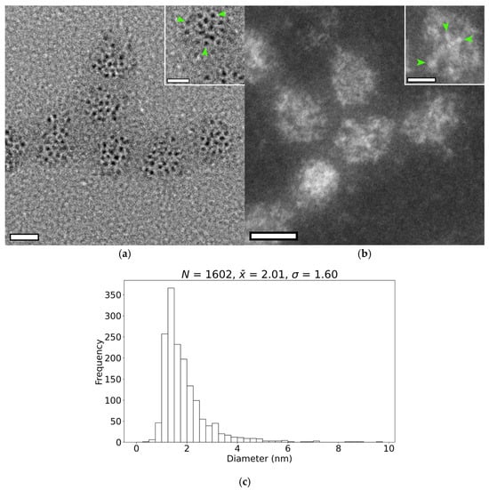 Imaging and size measurement of the internal nanoparticles. (a) Bright-field TEM image of unstained M. xanthus encapsulins. Scale bar: 20 nm Inset: two encapsulins with individual nanoparticles highlighted by green arrows. Image captured with a JEOL F200 at 200 kV. Inset scale bar: 10 nm. (b) HAADF STEM image of unstained M. xanthus encapsulins. Scale bar: 20 nm. Inset: single encapsulin with individual nanoparticles indicated by green arrows. Image captured on a JEOL ARM200F at 80 kV. Insert scale bar: 10 nm. (c) Distribution of nanoparticle diameters measured using both imaging techniques. The sample size (N), mean diameter (), and standard deviation (σ) (all in nm) are reported.