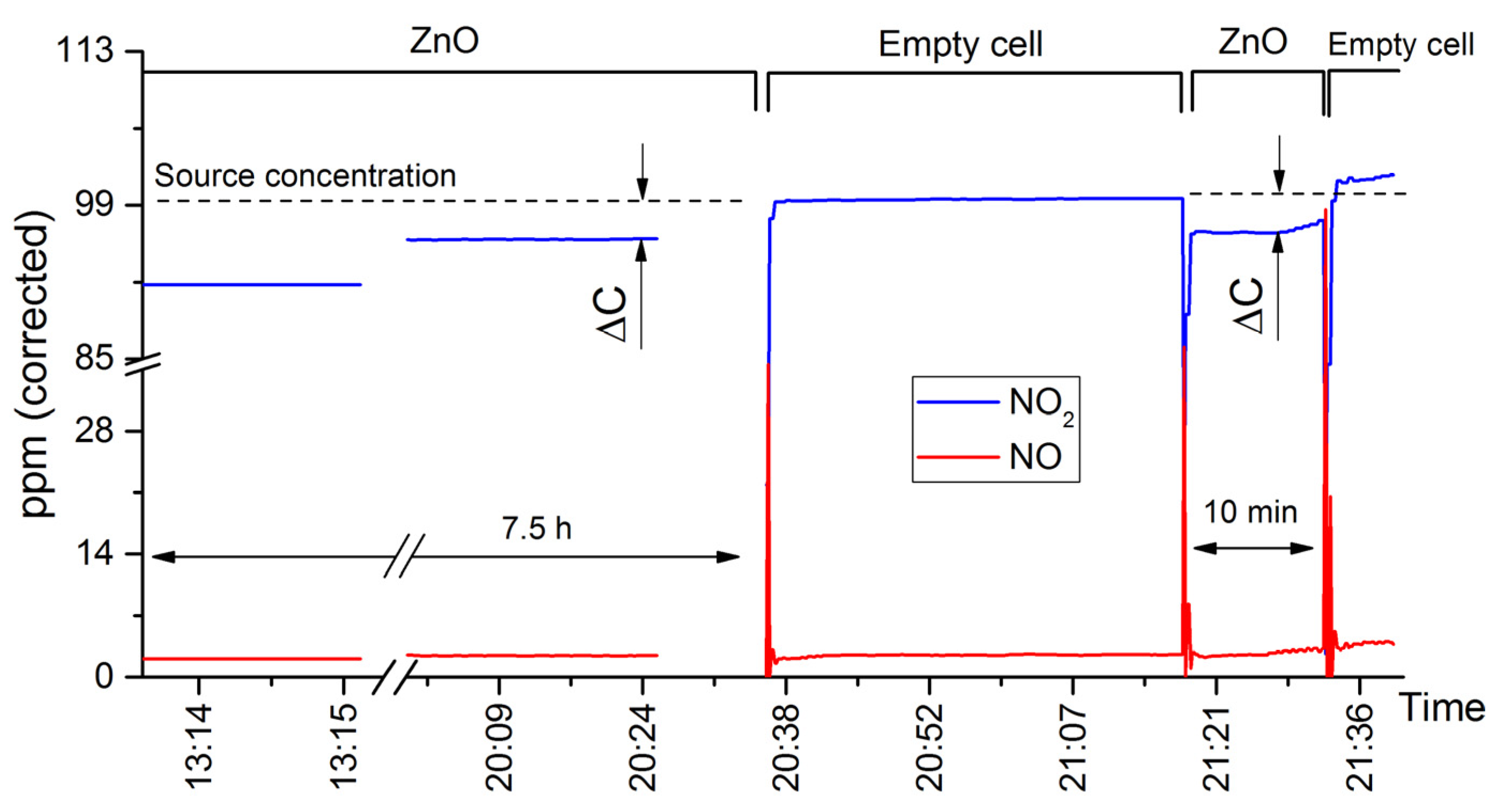 2.6. Long-Term NO2 Adsorption Measurements