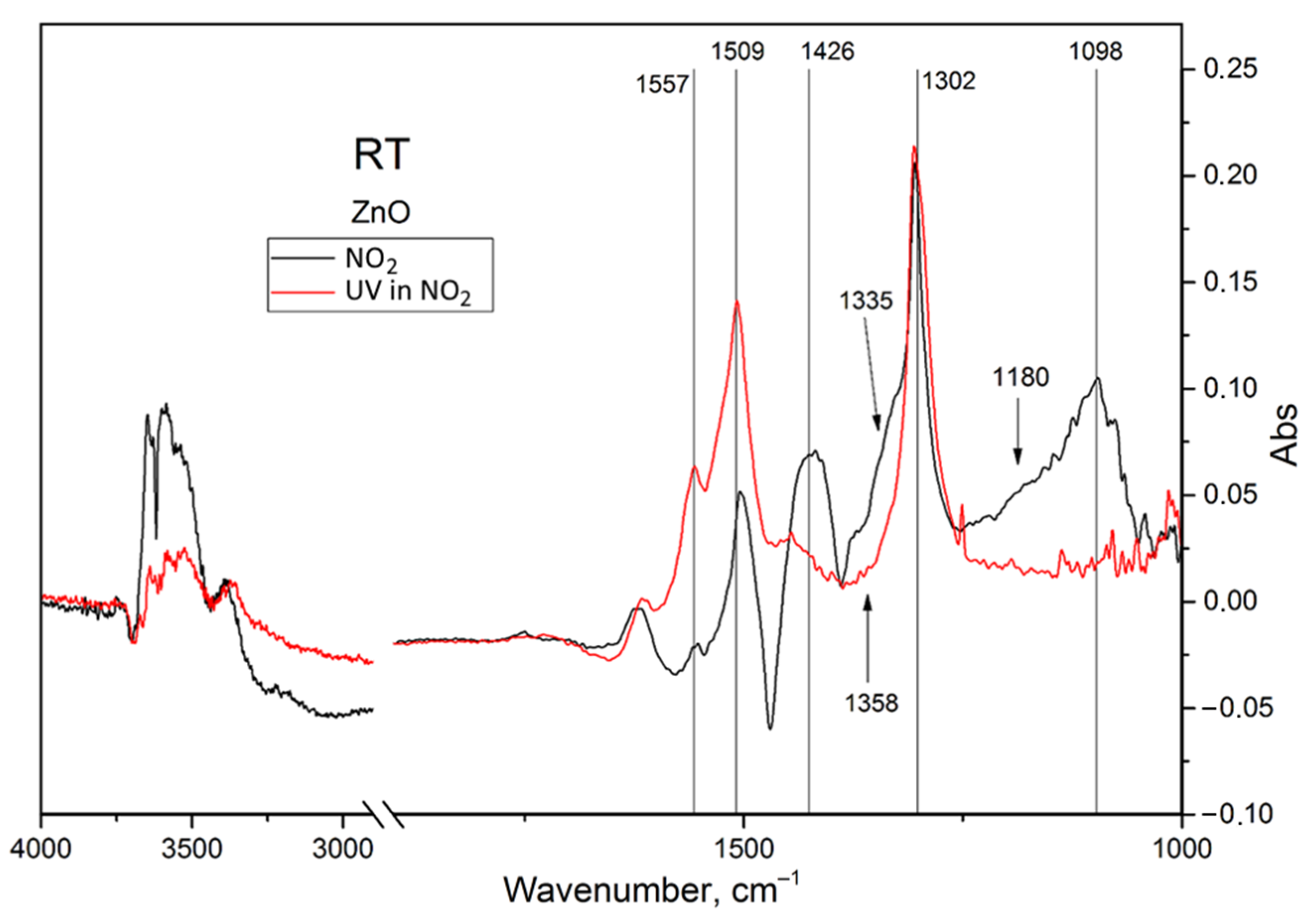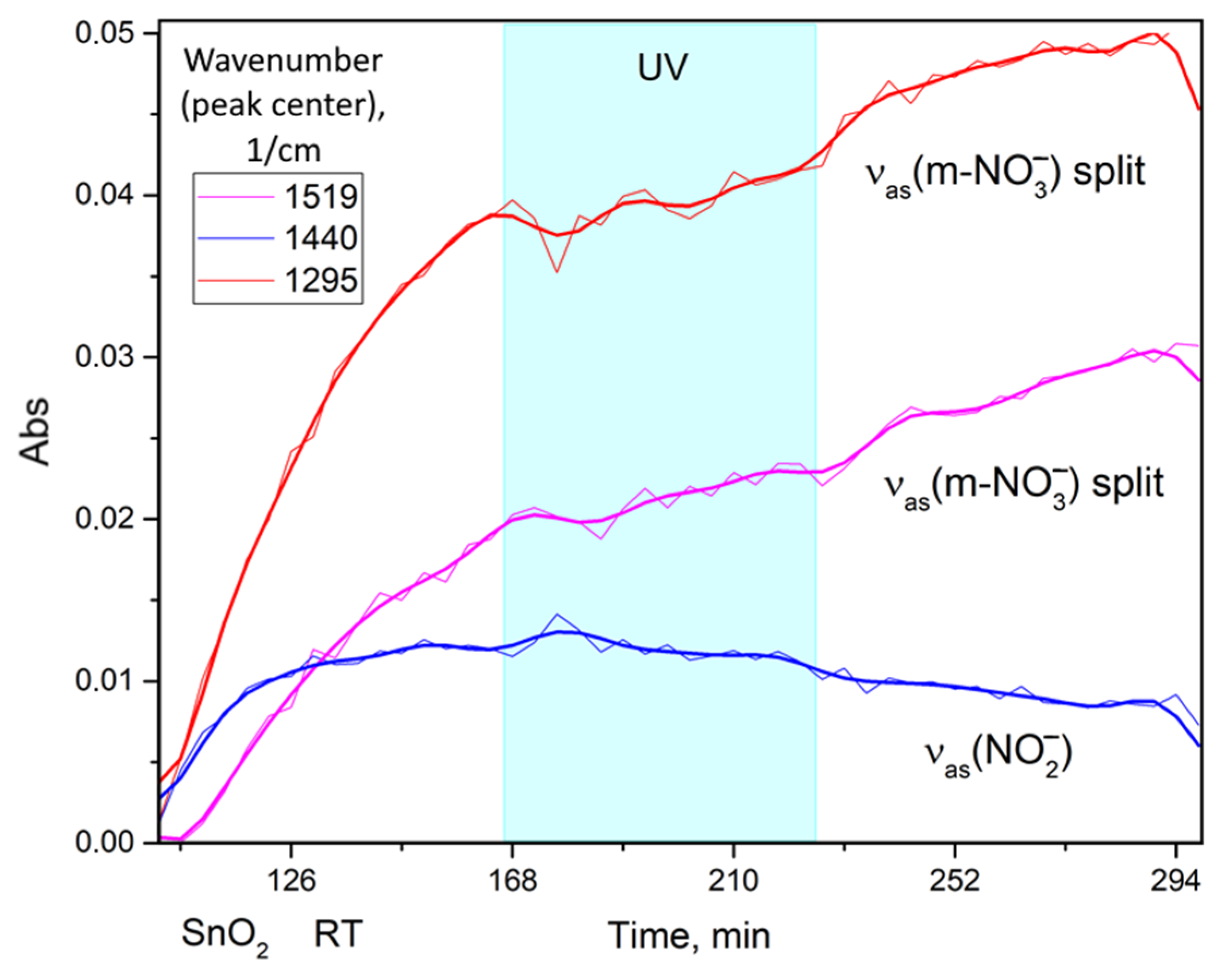 - Sivachandiran, L.; Thevenet, F.; Rousseau, A.; Bianchi, D. NO2 Adsorption Mechanism on TiO2: An in-situ Transmission Infrared Spectroscopy Study. Appl. Catal. B Environ. 2016, 198, 411–419. [Google Scholar] [CrossRef]
