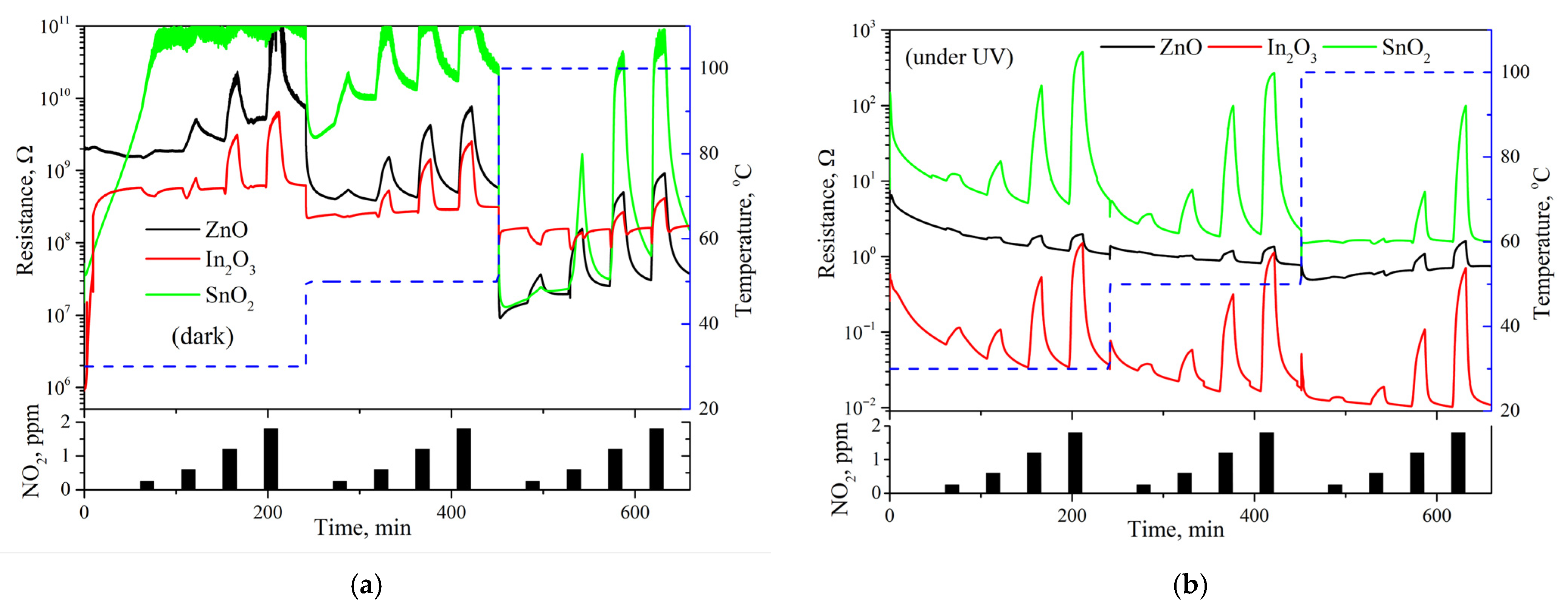 - Zhang, C.; Wang, J.; Olivier, M.-G.; Debliquy, M. Room Temperature Nitrogen Dioxide Sensors Based on N719-Dye Sensitized Amorphous Zinc Oxide Sensors Performed under Visible-Light Illumination. Sens. Actuators B Chem. 2015, 209, 69–77. [Google Scholar] [CrossRef]