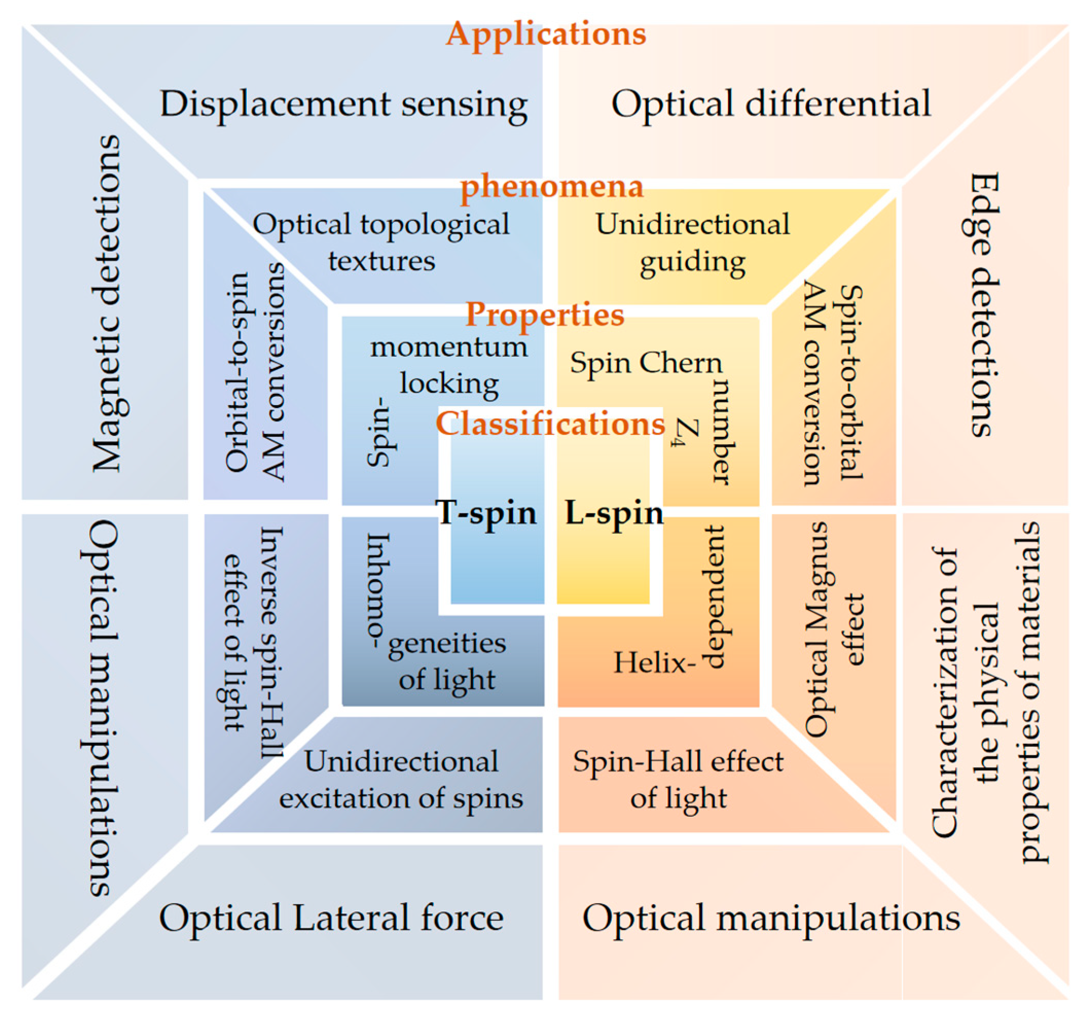 Furthermore, light exhibits particle properties and thus possesses angular momentum (AM). The SAM of light is intimately related to the circular polarization state of the optical field [9]. In recent years, a growing number of researchers have gradually shifted their attention toward the manipulation of optical SAM [10,11,12,13,14]. With the rapid advancement of modern micro–nano fabrication technologies, researchers can more easily and flexibly control multiple degrees of freedom of light. However, at the nanoscale, classical degrees of freedom of light such as intensity, phase, and polarization are coupled and interact with each other, making their independent and flexible manipulation relatively challenging. In this context, the control of SAM offers certain advantages over the manipulation of other degrees of freedom. For example, through spin–orbit interactions [15,16,17], SAM and orbital AM (OAM) can be manipulated independently, enabling more precise manipulation and utilization of the spin properties of photons without interference from other optical parameters. The numerous advantages of SAM open up new possibilities for photonics, particularly in optical manipulation [18,19,20,21,22,23,24,25,26,27,28], sensing [29,30,31,32,33,34,35], information processing [36,37,38,39,40,41,42,43,44,45,46,47,48], chiral quantum optics [49,50,51,52,53,54,55,56,57], and quantum entanglement [58,59,60,61,62,63,64,65,66,67].