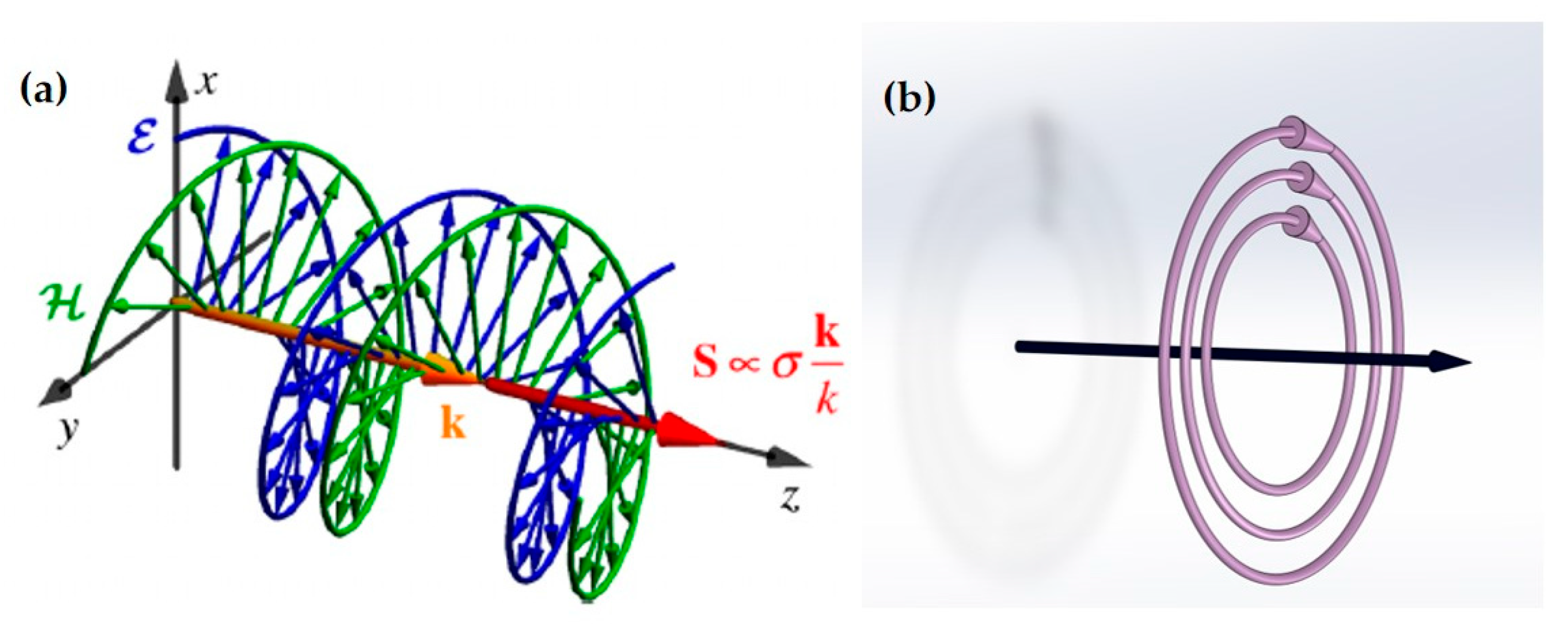 Figure 2. Momentum and spin in circularly polarized plane waves [114]: (a) Instantaneous electric and magnetic fields during the propagation of circularly polarized (m = i) plane wave. (b) The black and purple vector arrows represent the orbital momentum density and spin-momentum density, respectively.