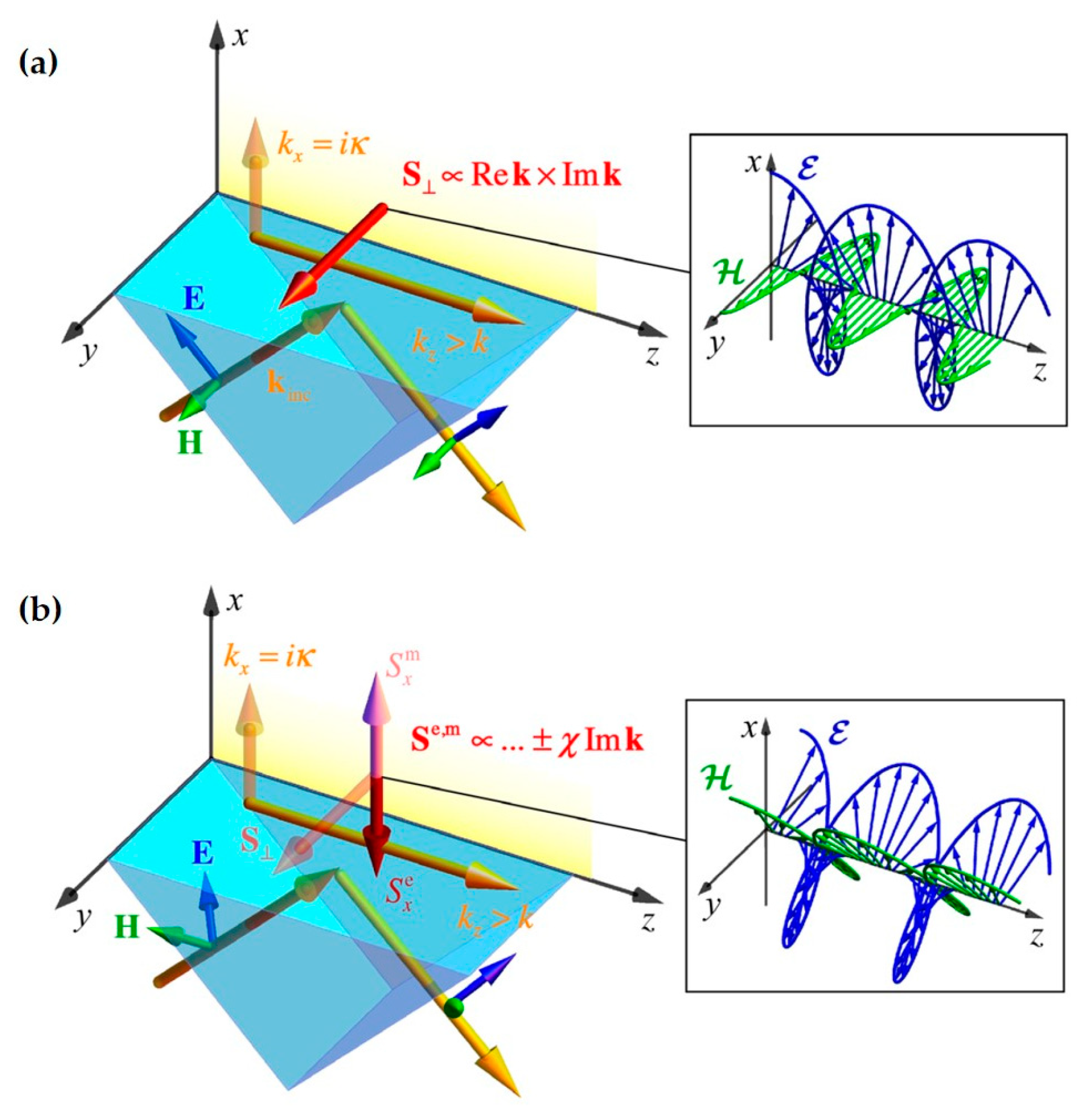 Figure 3. The evanescent wave generated by total internal reflection has a transverse spin angular momentum (t-SAM) density [12]: (a) the inset shows the z-evolution of the instantaneous electric and magnetic fields and for the simplest linear x-polarization; (b) when the polarization direction is along ±45, the generated evanescent wave has a t-SAM density S e , m , which is the result of the combined effect of electric and magnetic fields.