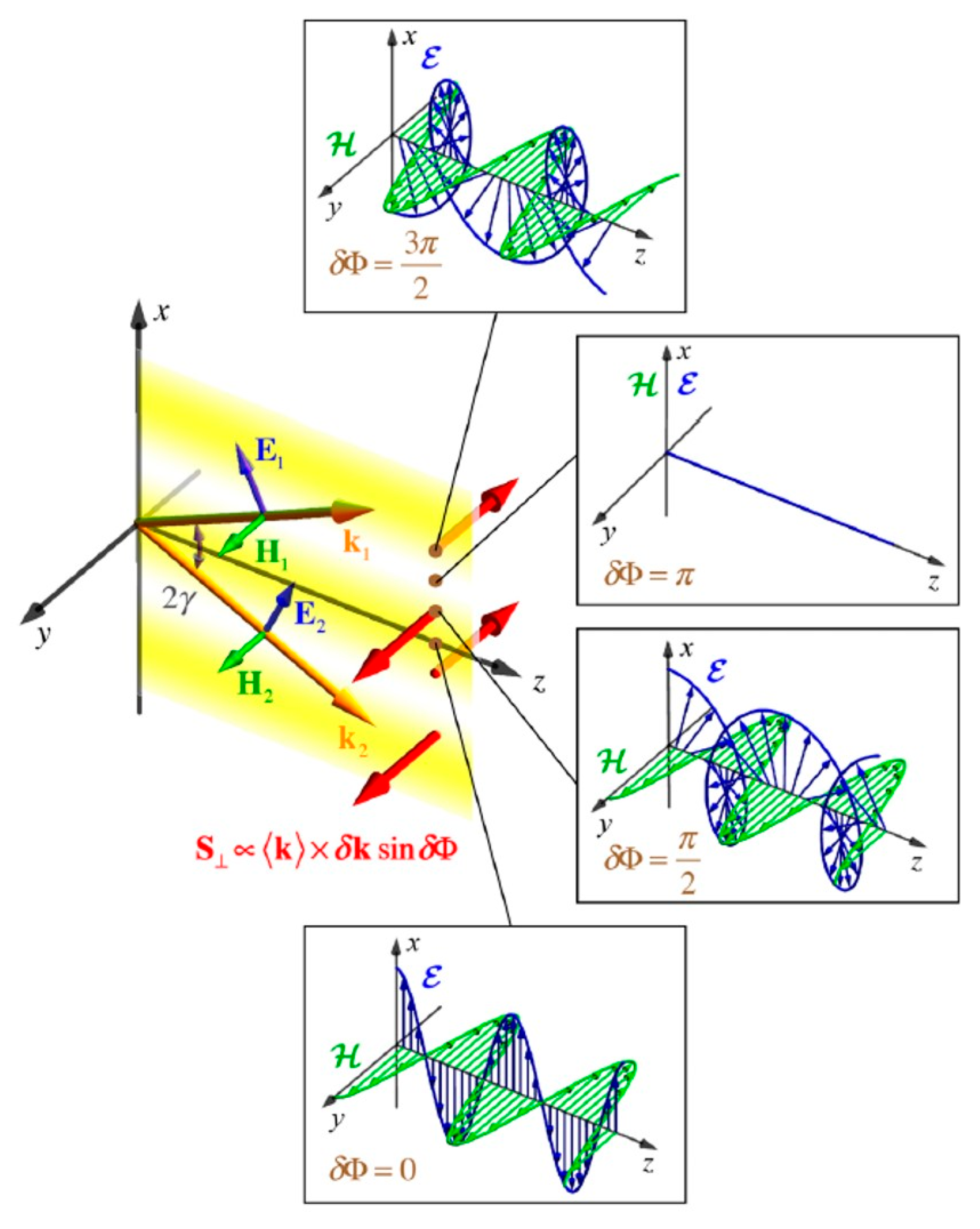 where δ Φ = Φ 1 Φ 2 = 2 k x Δ x represents the phase difference between the two beams in the x direction, and the polarization states of the two beams are the same: m 1 = m 2 = m , ( τ 1 , χ 1 , σ 1 ) = ( τ 2 , χ 2 , σ 2 ) = ( τ , χ , σ ) . Note that the longitudinal electric field component E z i k z sin ( δ Φ / 2 ) k z ¯ . By analogy with the E z component in evanescent fields, both are imaginary components. E z differs from the transverse electric field components by an imaginary unit i , meaning that for the interference field, the field quantities can also rotate in the x-z, y-z planes, generating a transverse SAM density perpendicular to the total wavevector k.