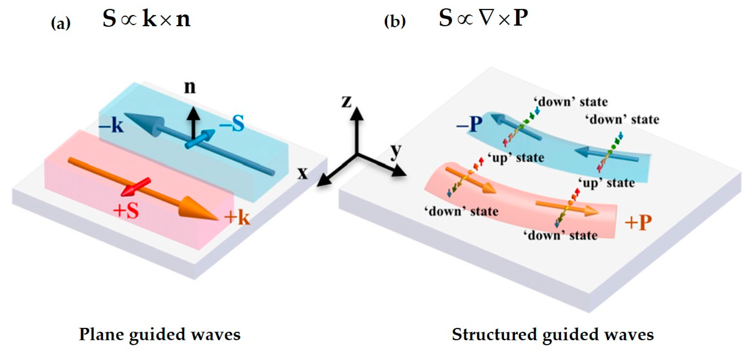 Figure 5. The spin-momentum locking properties of structural evanescent fields [15]: (a) in evanescent plane wave, optical spin-momentum locking results in the transverse spin S uniformly distributed and parallel to the interface. The spin vector direction is perpendicular to the wavevector k and flips if the propagation direction flipped from +k to −k; (b) in the structural evanescent field, the optical spin is related to the vorticity of the energy flow density P/Poynting momentum p. The transverse spin vector varies from the “up” state to the “down” state around the energy flow density, remaining perpendicular to the local wavevector. This forms a chiral swirl of the 2D transverse spin which is locked to the energy propagating direction and fulfills a right-handed rule. The direction of the local transverse spin vector flips if the energy flow density flipped from forward (+P) to backward (−P).