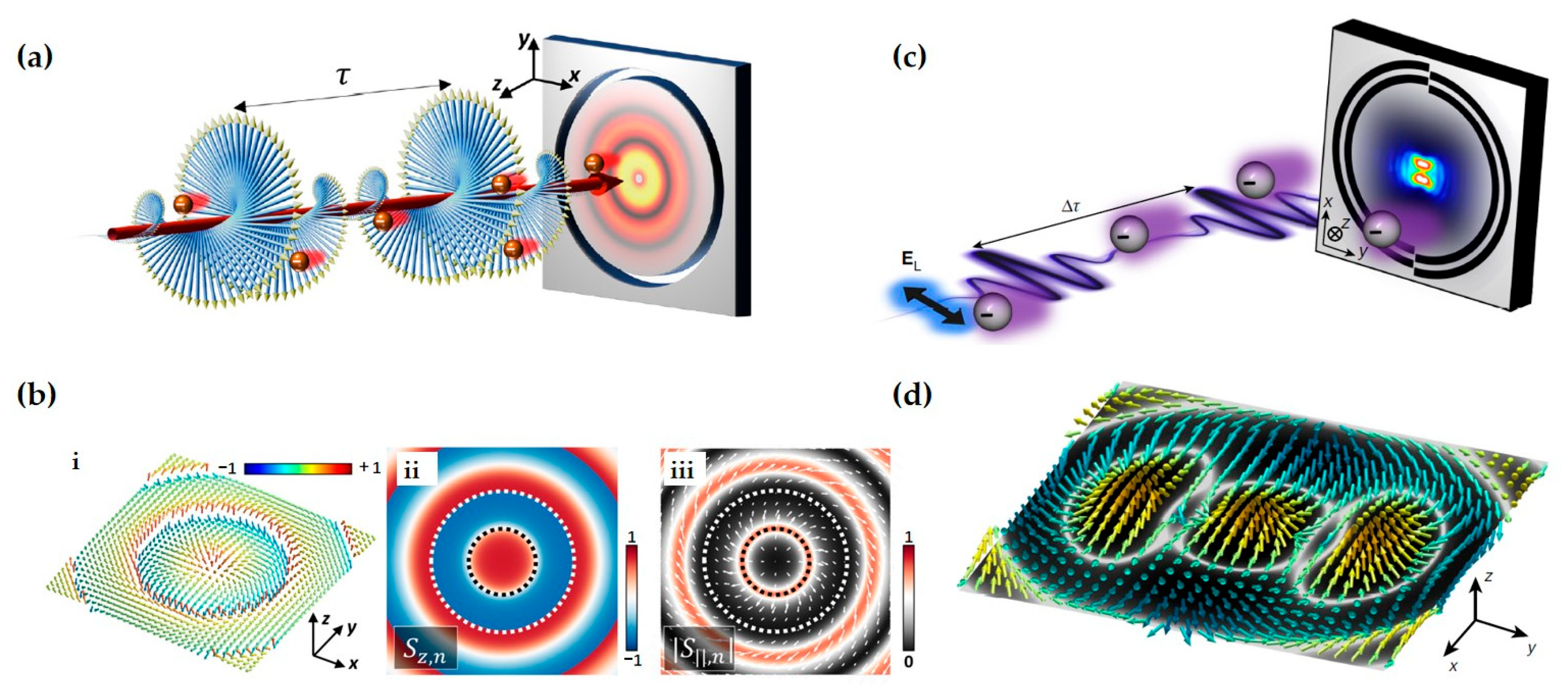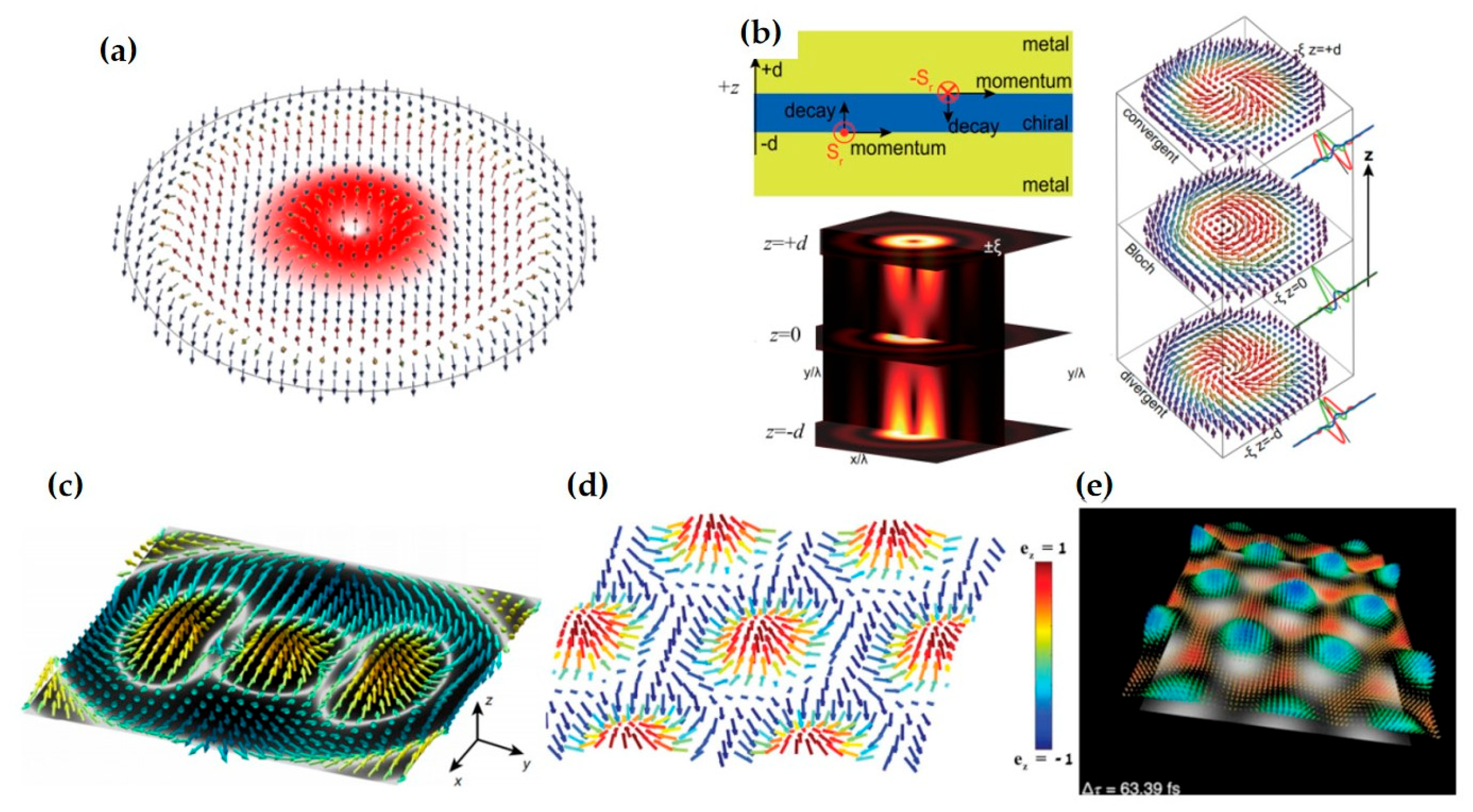 Notably, the spin vector aligns tangentially to the interface at the momentum density maxima and normal to it at the nodes. This allows the spin variation period to be defined between two adjacent nodes of the kinetic momentum density, a behavior exhibited by topological solitons [83,84,161,162]. Consequently, spin–orbit coupling gives rise to a variety of intriguing photonic spin structures. Examples include the Néel-type photonic spin skyrmion in an evanescent optical vortex (Figure 6a) [24,84,85,161], the Bloch-type skyrmion emerging with a layer of chiral material (Figure 6b) [24,25,85,161], and meron-like spin structures in specially designed fields (Figure 6c) [88]. In the absence of spin–orbit coupling, however, these spin topologies degenerate into dynamic field–skyrmions (Figure 6d,e) [163,164]. These compelling real-space topological structures and their ultrafast dynamics have garnered significant recent interest, opening new pathways in topological photonics, quantum photonics, metrology, and optical manipulations [165], while also providing fresh avenues for exploring topological condensed matter systems [155,166,167].