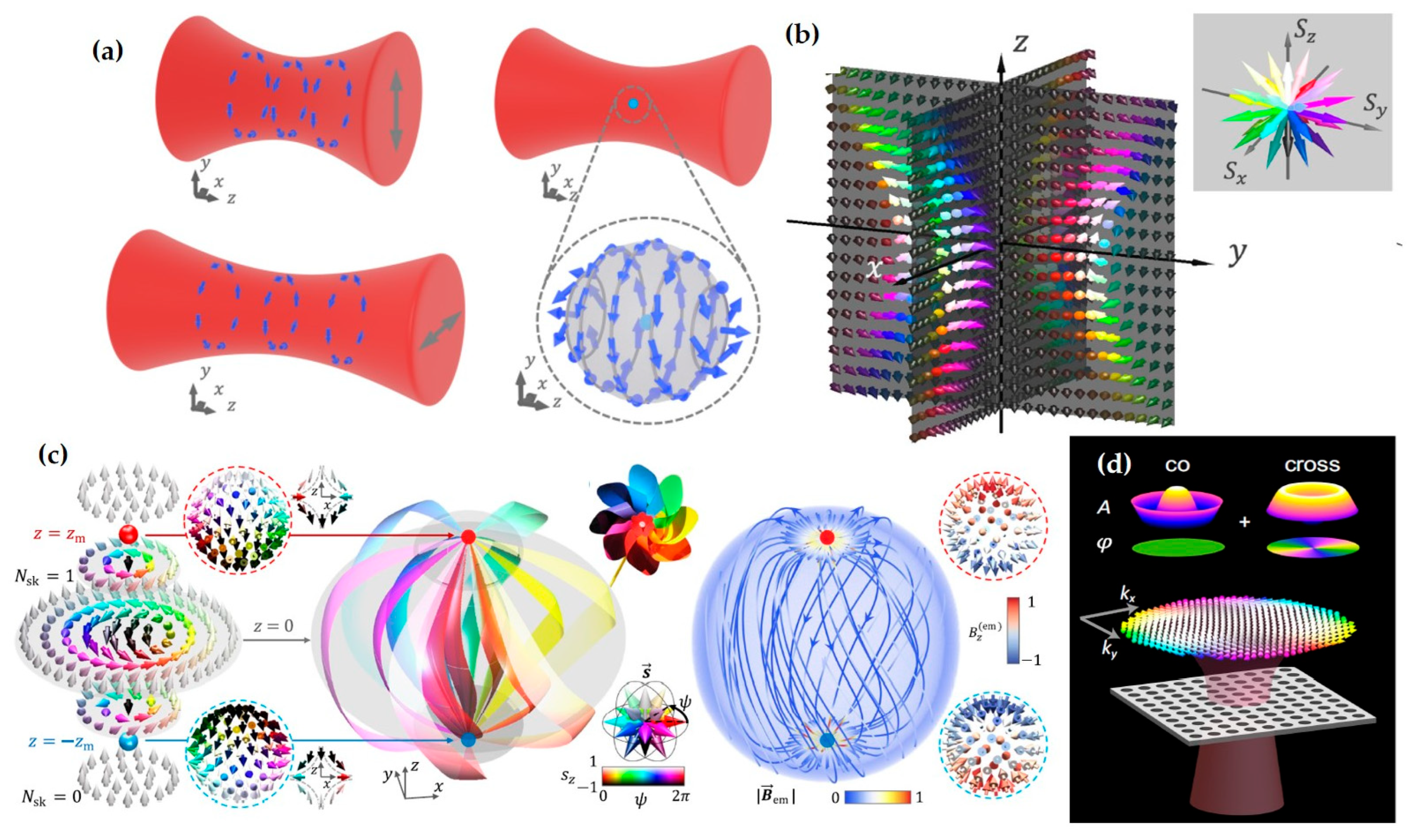 Figure 7. Various kinds of photonic spin topological structures in free space: (a) a topological spin defect at the focal point and the corresponding normalized spin vectors [169]; (b) photonic spin Hopfions in 3D real space [170]; (c) a toron topology in high-dimensional space [171]; (d) the generation of meron topologies in BICs [172].