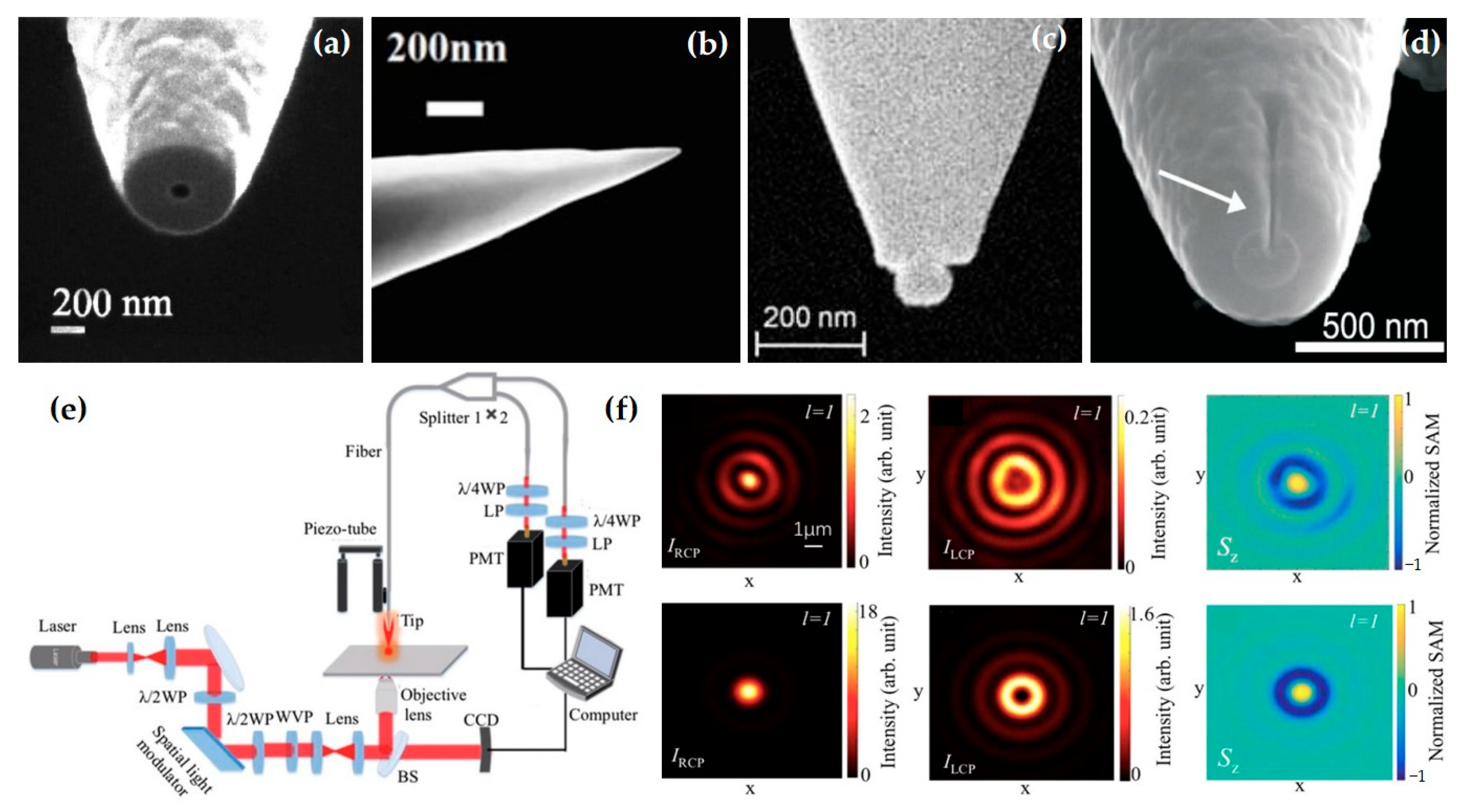 For example, detecting the SAM in surface plasmon polaritons typically involves near-field scanning optical microscopy (NSOM). Probe-based NSOM systems can effectively extract desired electromagnetic field components, with resolution flexibly controlled through probe design [93]. Alternatively, scattering particles made from tailored materials and sizes can also perform such detection with additional functional capabilities [94,95,96,97,98]. In recent years, several far-field detection techniques have attracted attention, such as methods employing nonlinear effects to convert near-field plasmonic information into far-field signals that can be captured using imaging elements [99].