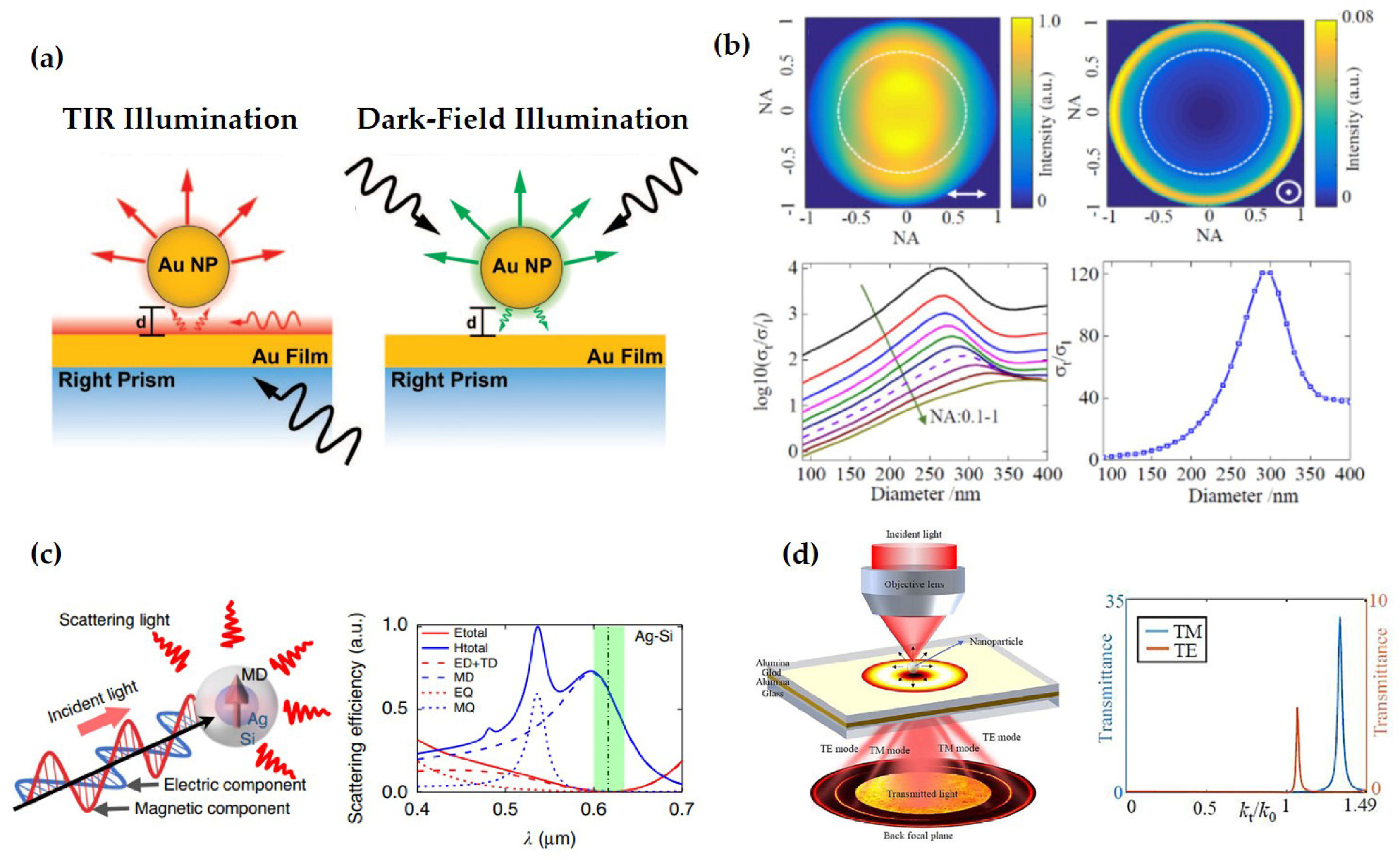Figure 9. Nanoparticle–film structures for the detection of SAM: (a) two different excitation methods of nanogold particle–gold film structure [181]; (b) research on optical response of PS nanoparticles [102]; (c) Ag core–Si shell probe particles used for detecting magnetic field components, the electromagnetic response curve of the particles is shown in the figure on the right [91]; (d) schematic diagram of the coupling process between tightly focused beam and nanoparticle–waveguide structure. The right figure shows the calculation of Fresnel coefficients for different modes in this structure [104].
