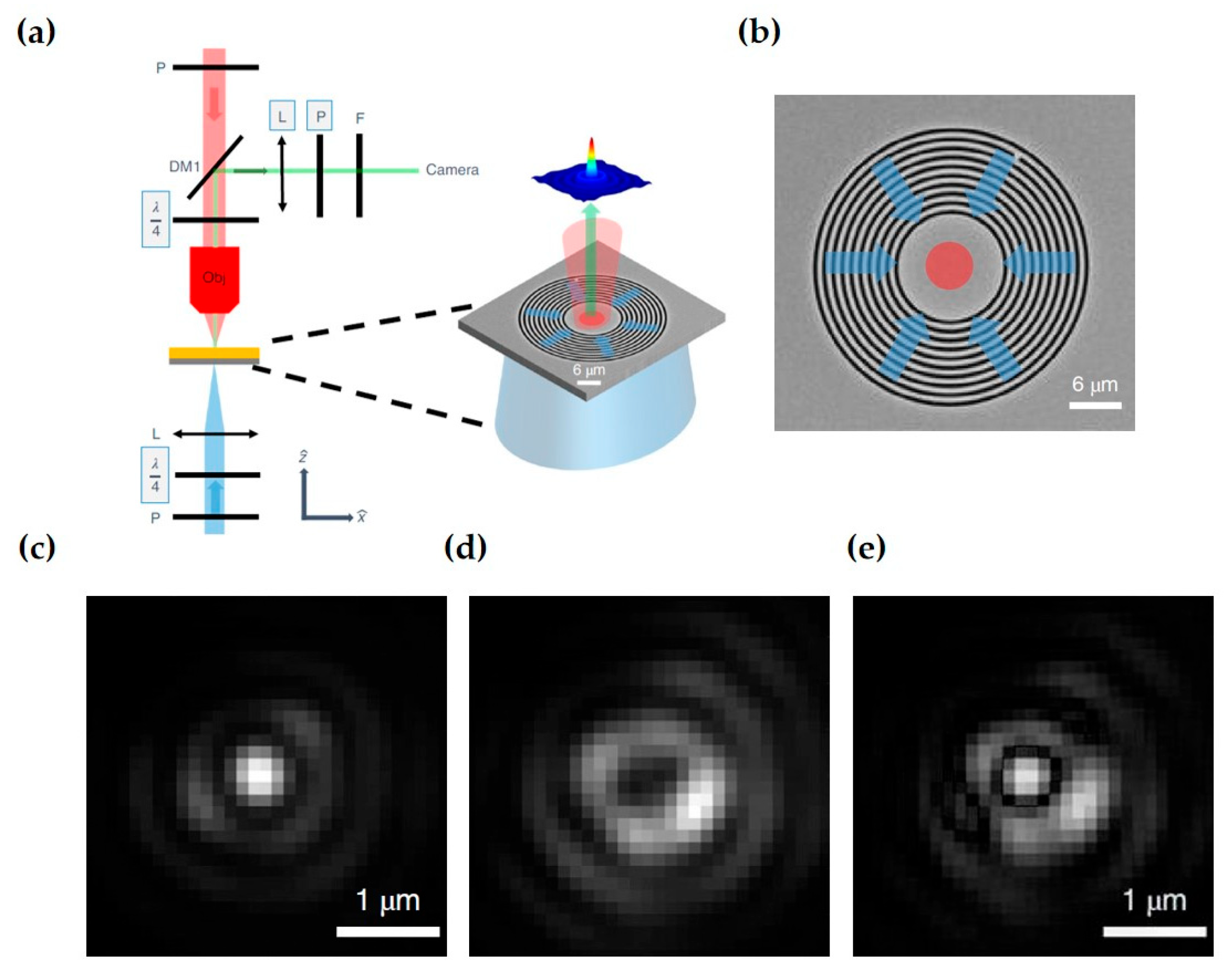 Figure 10. SAM detection system based on nonlinear effects: (a) optical path configuration of nonlinear near-field optical microscopy [99]; (b) circular coupled grating structure for exciting SPP [99]; (c,d) represent the near-field distribution obtained by illuminating the grating with left-handed and right-handed circularly polarized pump beams, respectively; (e) shows the author’s differential results on the two figures.