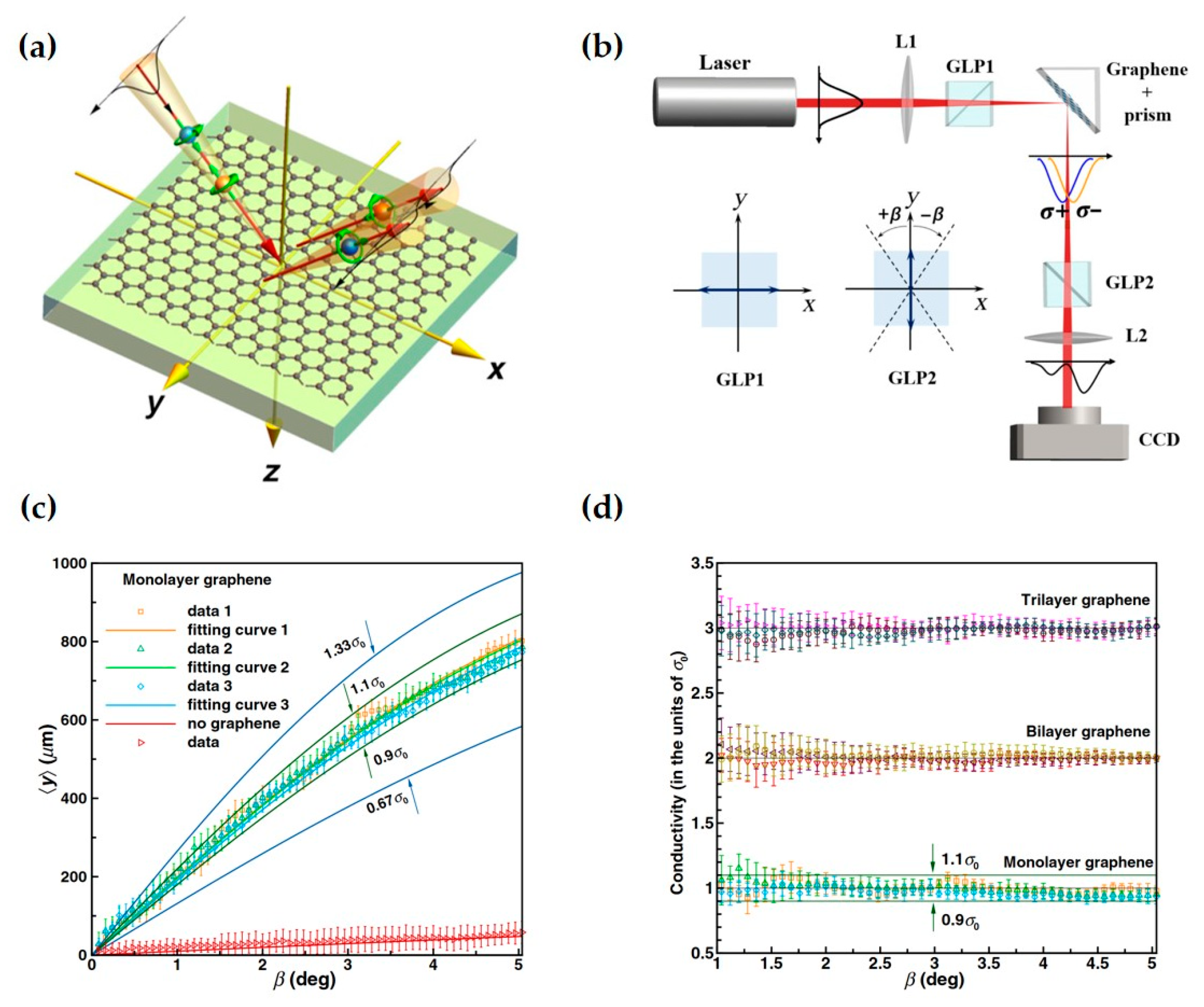 Figure 12. Precision measurement of graphene’s optical conductivity by SHE [35]: (a) SHE at an air-graphene interface; (b) experimental setup to detect the tiny spin–orbit interaction of light in graphene; (c) amplification of pointer shifts as a function of the post-selected angle β ; (d) measurement of the optical conductivity in the unit of σ 0 for monolayer, bilayer, and trilayer graphene.