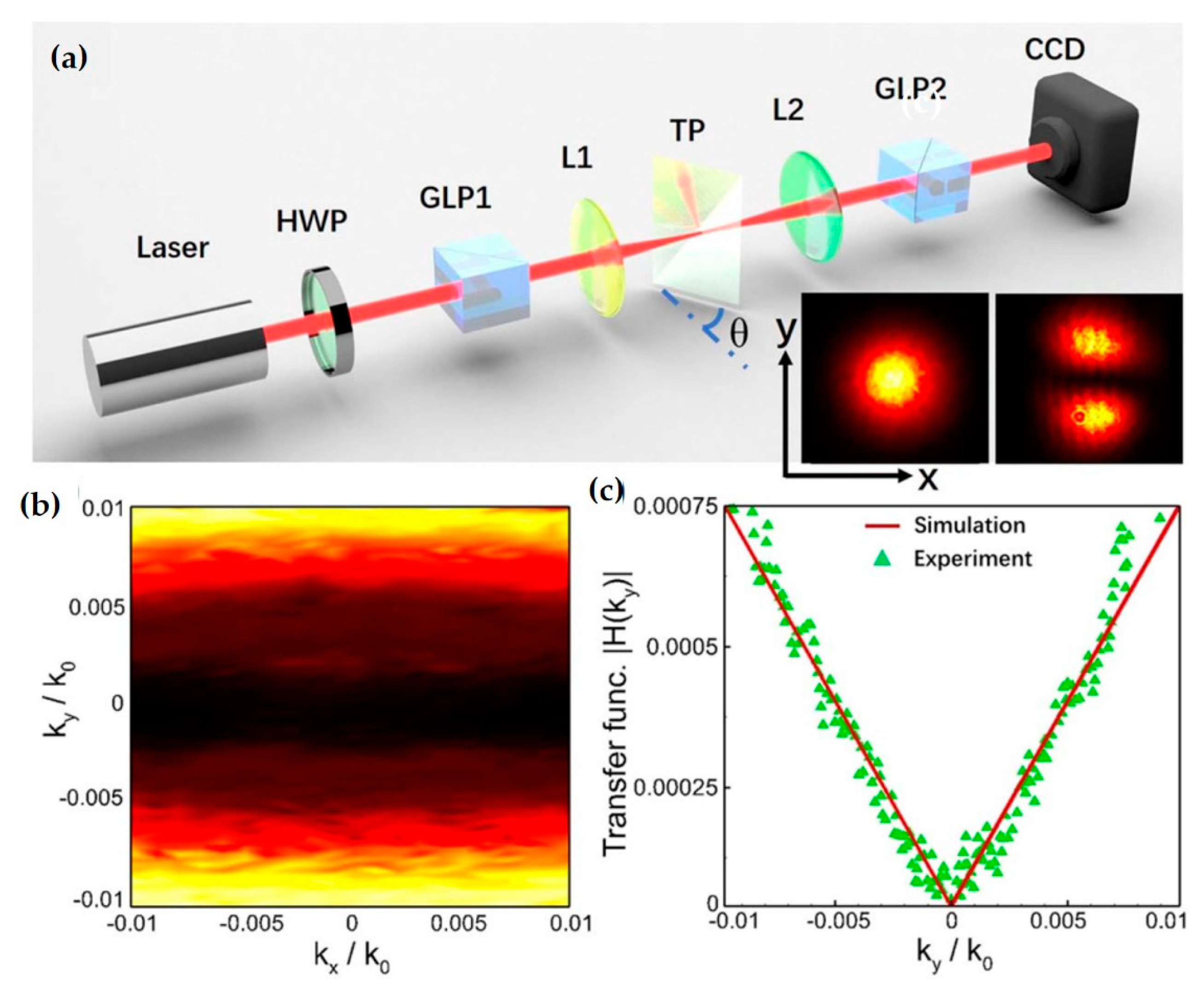 Figure 13. Spatial differentiation demonstration at a tilted polarizing interface [39]: (a) schematic of the experimental setup for observing splitting beams based on quantum weak measurement. The insets correspond to spatial differentiation results for a Gaussian illumination with the inclination angle θ = 45°; (b) measurement of the spatial spectral transfer function at a tilted polarizing interface; (c) detailed dates of the transfer function extracted from (b), when k x / k 0 = 0 .