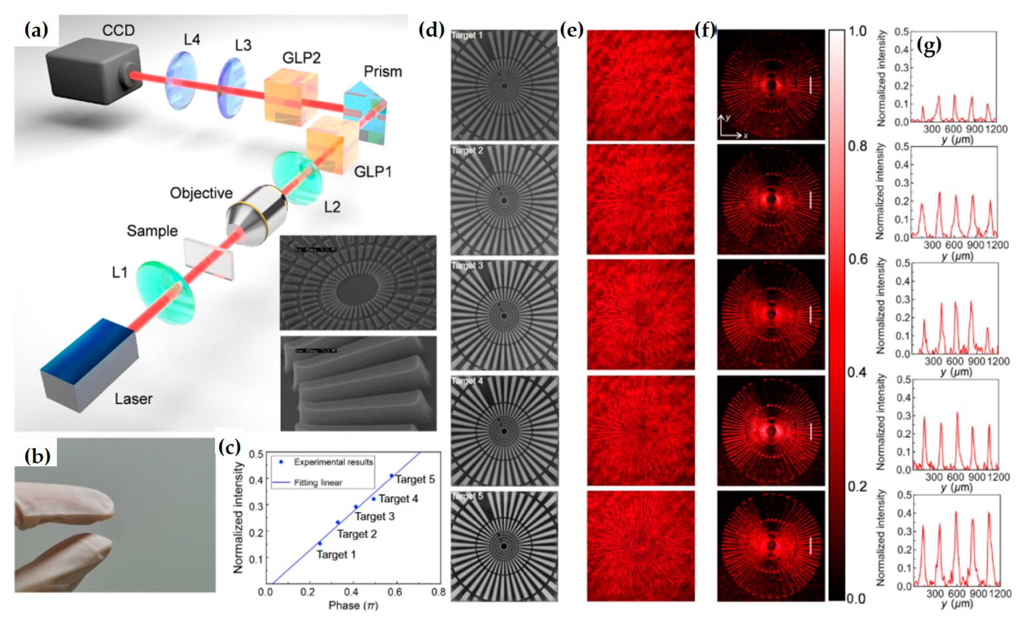 Figure 14. Microscopic imaging experiment on quantitative-phase-microscopy targets [40]: (a) experimental setup for photonic spin Hall differential microscopy. The insets in (a) are SEM images of a 350 nm focus star on the resolution target; (b) photograph of the phase target; (c) relationship between the horizontal-direction intensity of five edge images and the phase gradient of five focus-star targets; (d) images of targets 1–5 selected from user report for quantitative-phase-microscopy target. (e,f) Bright-field and differential images of the quantitative-phase target; (g) intensity curves corresponding to the white lines across the edge images in (f).