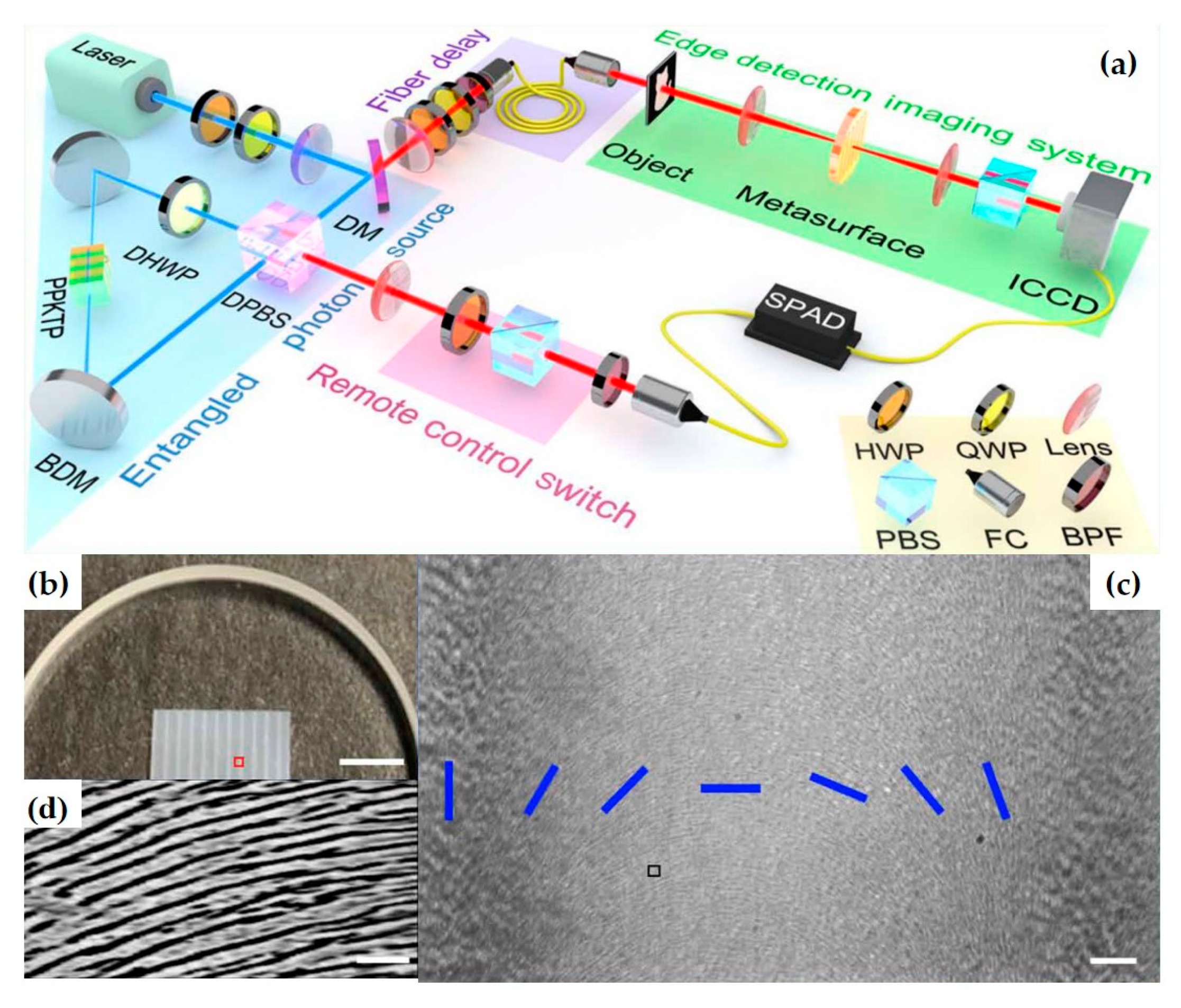Figure 15. Experimental setup and sample characterization [47]: (a) experimental setup of metasurface-enabled quantum edge detection; (b) photograph of the partial metasurface sample. Scale bar, 4 mm; (c) polariscopic analysis characterized by crossed linear polarizers of the sample area marked in (a). The blue bars indicate the orientation of rotated nanostructures in one period, which represents the Pancharatnam–Berry phase induced by the laser writing dielectric metasurface. Scale bar 50 nm; (d) the scanning electron microscopy image of the sample area marked in (c).