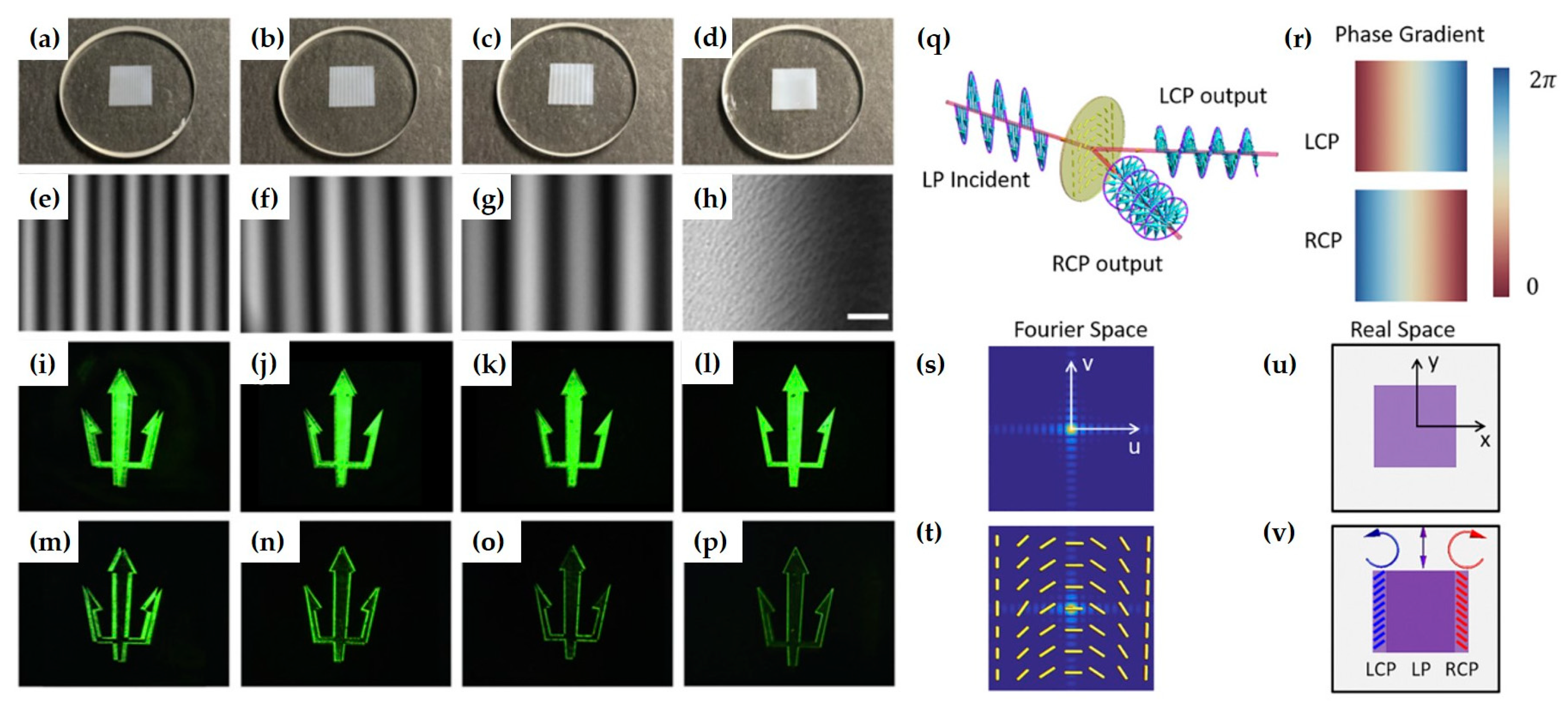 Figure 16. Experimental schematic of edge detection based on phase gradient metasurface [38]: (ap) edge detection with various resolutions at the wavelength of 500 nm; (qv) the proposed concept of edge detection based on a designed phase gradient metasurface. (q) When PB phase gradient metasurface is illuminated by collimated LP beam, two separated LCP and RCP beam components are observed. (r) Resultant phase gradient of LCP and RCP component. The Fourier space spectrum (s) and real-space image (u) of a square object. (s) and (u) will be changed to (t) and (v), respectively, when a PB phase gradient metasurface is added at the Fourier plane. Blue- and red-shaded areas indicate the resultant edge information along the PB phase gradient direction.