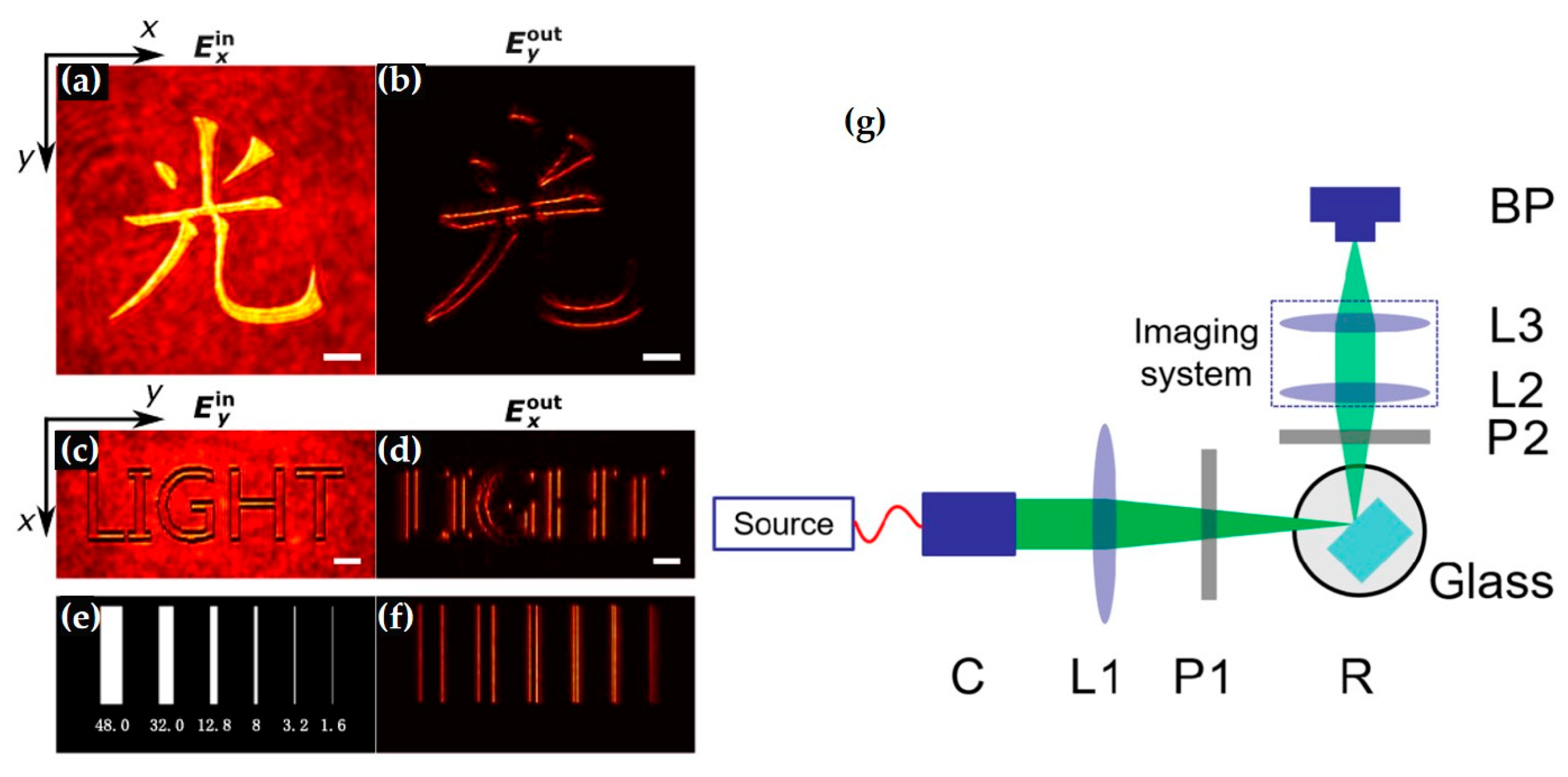 Figure 17. Spatial difference technique based on SHE [36]: (a) incident image consisting of the Chinese character for “light” with amplitude modulation on E x i n ; (b) reflected intensity image corresponding to (a) by measuring E y o u t ; (c) incident image consisting of the LIGHT letters generated with phase modulation on E y i n , where the inside and the outside of the letters have different phases but the same intensity; (d) reflected intensity image corresponding to (c) by measuring E x o u t . The white bars correspond to the length of 50 μm; (e) slot test patterns on the SLM with the different phases for the black and the white areas. The widths of the slots are listed below in micrometers; (f) measured reflected intensity image corresponding to (e); (g) Experimental setup for spatial differentiation under Gaussian beam illumination. Edge detection for different images stored in E x i n and E y o u t , respectively, with either amplitude or phase modulation.
