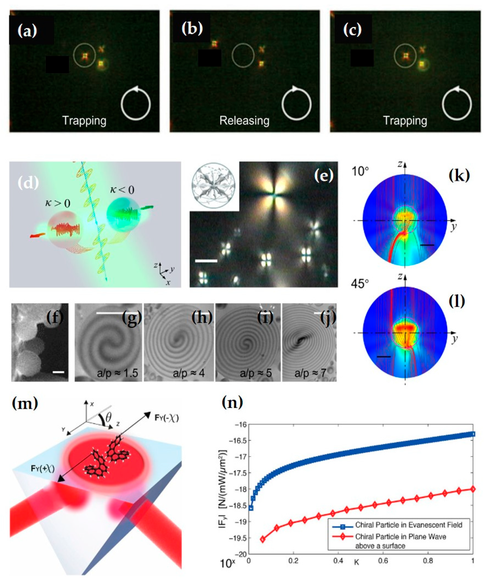 Figure 18. Generation and application of optical lateral forces: (ac) optical gradient force on chiral particles. Experimental frames of the trapping, detrapping, and trapping of a cholesteric liquid crystal particle by switching the light polarization [188]; (dl) experimental demonstration of the bidirectional enantioselective separation of a microsized cholesteric liquid crystal particle [189]. (m,n) Optical lateral force on the chiral particle in a linearly polarized evanescent wave [20].