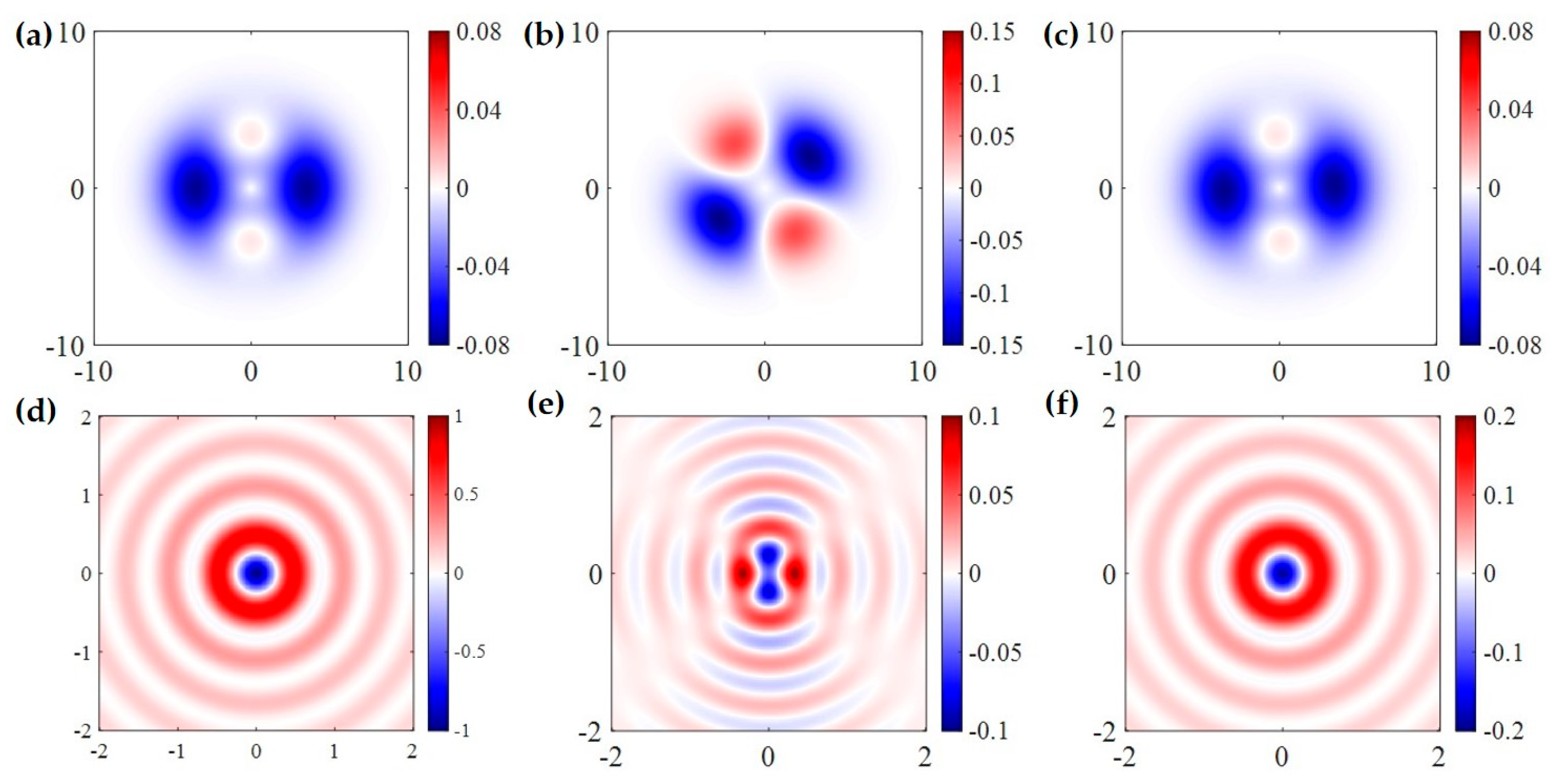 Figure 19. Optical backflow-induced lateral optical forces [193]: (a) azimuthal optical backflow generated by superposed OAM beams; (b) axial optical backflow generated by tightly focused cylindrical vector beams; (c,d) optical force distributions on dipolar nanoparticles showing local force reversal that does not coincide with the backflow region; (e,f) optimized material parameters leading to a force field consistent with the reversed energy flow.