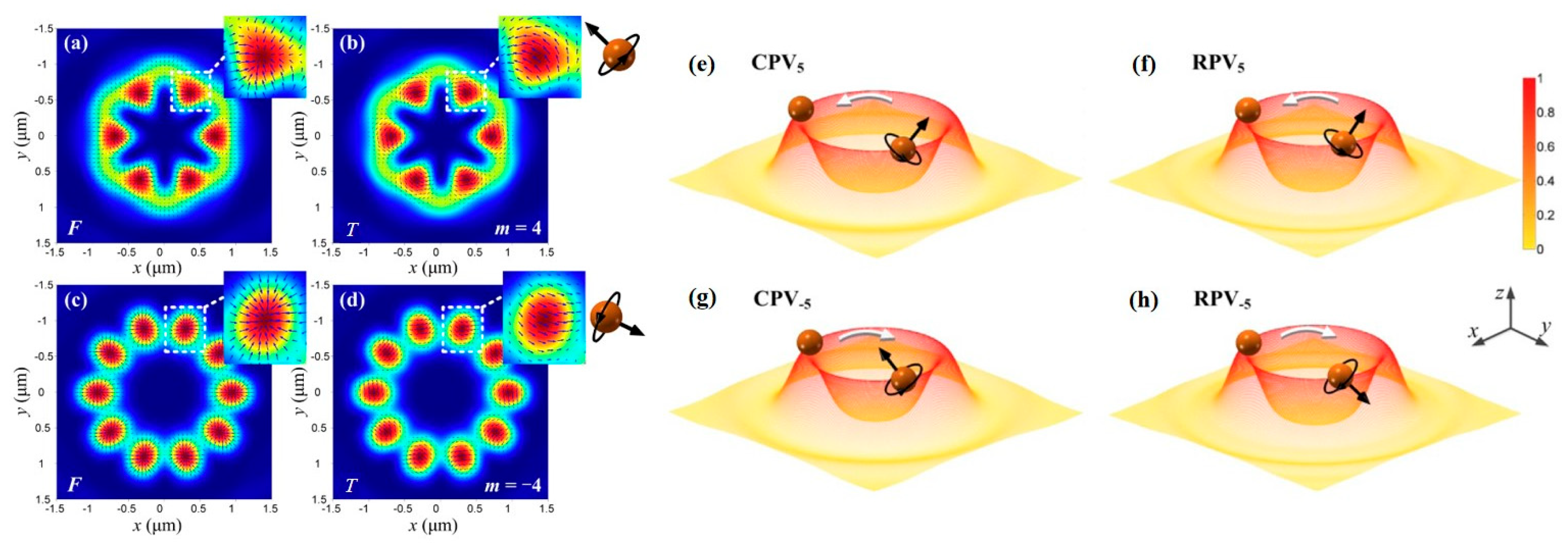 Figure 20. Optical lateral force and spin motion of different beams: (ad) show the lateral force and spin torque distributions in the focal plane illuminated by vector vortex beams with topological charges (a,b) m = 4 and (c,d) m = −4 [194]; (eh) show the spin and orbital motion of the particle illuminated by circularly polarized vortex beam inputs with topological charges of (e) m = 5 and (g) m = −5, and by radially polarized vortex beam inputs with (f) m = 5 and (h) m = −5 [195].