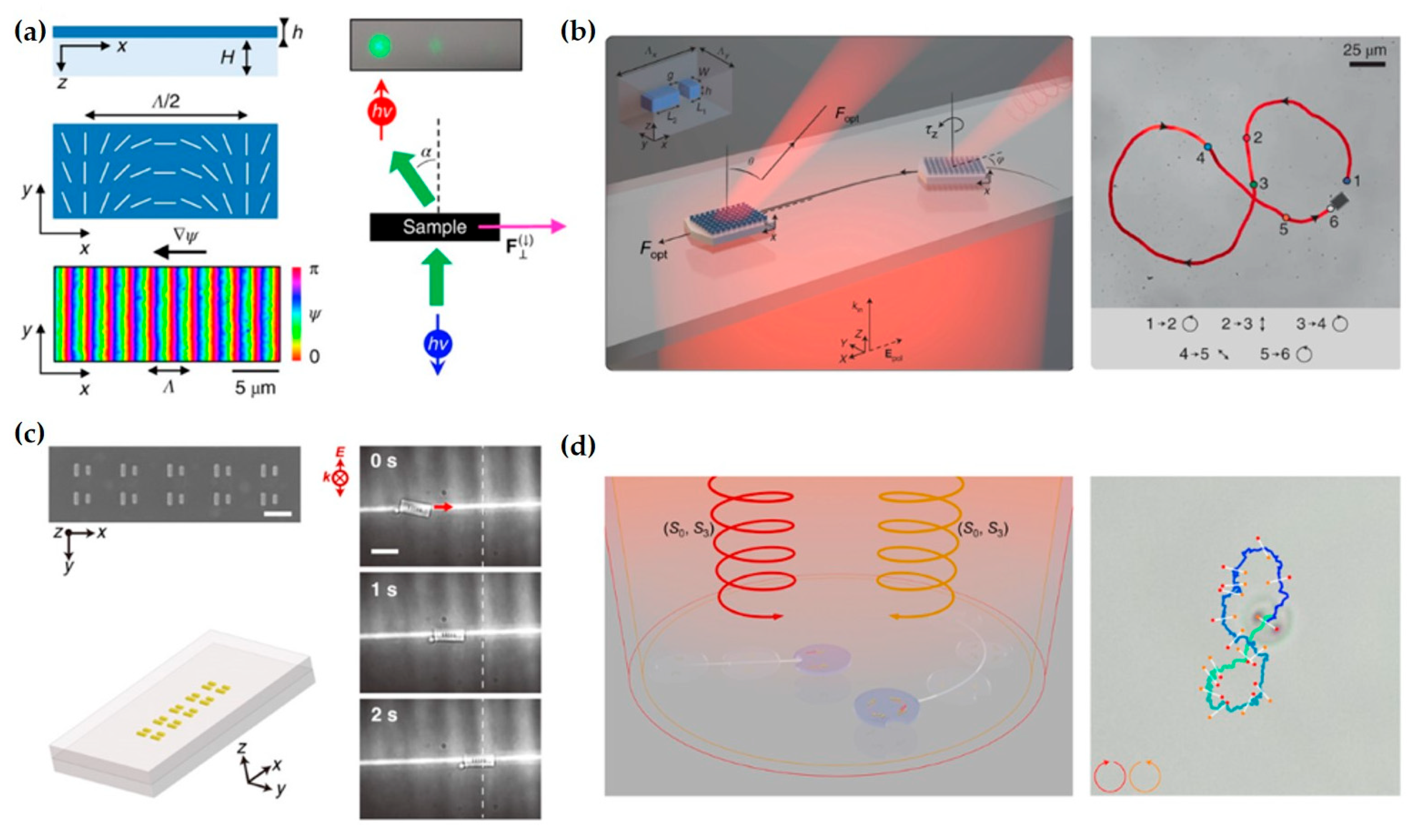 Figure 21. Microrobots based on OLFs: (a) one-dimensional microrobot which can move bilaterally with different helicity of light [196]; (b) one-dimensional linear microrobot by the OLF on a plasmonic nanoantenna, allowing the moving resolution to be beyond the diffraction limit [197]; (c) two-dimensional microrobot excited by both linear and CPL waves [198]; (d) three-dimensional light-driven microdrones using two overlapping light waves with two wavelengths [199].