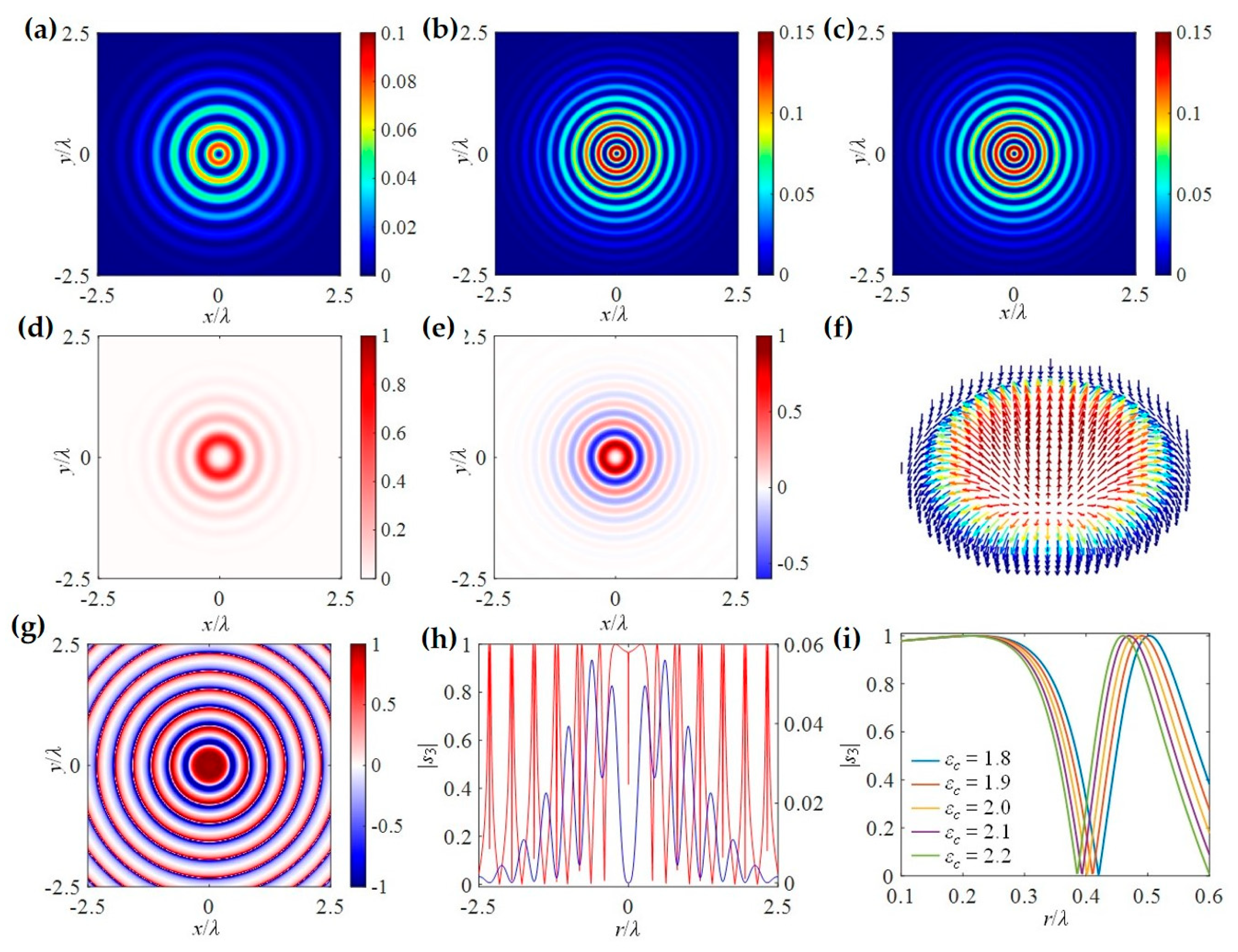 Figure 22. Simulated result of tunable optical spin skyrmions and spin fine structures at a metal/GRIN interface [200]: (ac) electric field intensity distributions of the excited SPPs under different GRIN parameters: (a) ε c = 2 , g =   2 ; (b) ε c = 5 , g =   2 ; (c) ε c = 5 , g =   5 ; (di) results obtained for GRIN parameters ε c = 2 and g =   2 : radial and (e) axial (z) components of the SAM density; (f) normalized spin vector structure; (g) polarization ellipticity s3; (h) one-dimensional contour of s 3 and the corresponding horizontal field component ( E ) along the radial direction; (i) gradient of the spin fine structure along the radial direction.