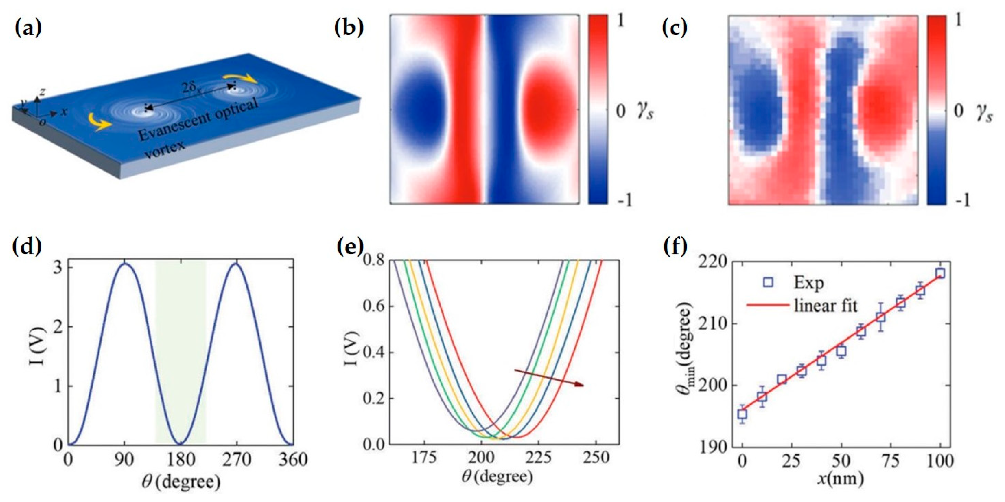 Figure 23. SAM applied to precision displacement sensing [29]: (a) illustration of the structured spin texture in a skyrmion-pair; (b,c) the spin distribution structure is obtained from γ s = ( I R C P I L C P ) / ( I R C P + I L C P ) . These two figures show the theoretical results and experimental measurements of the structure; (d,f) a typical response curves for displacement sensing; (e) illustrates the intensity curves and corresponding dip shifts measured via a rotating polarizer as the probe nanoparticle is displaced; (f) calibration curve of the dip angle versus displacement.