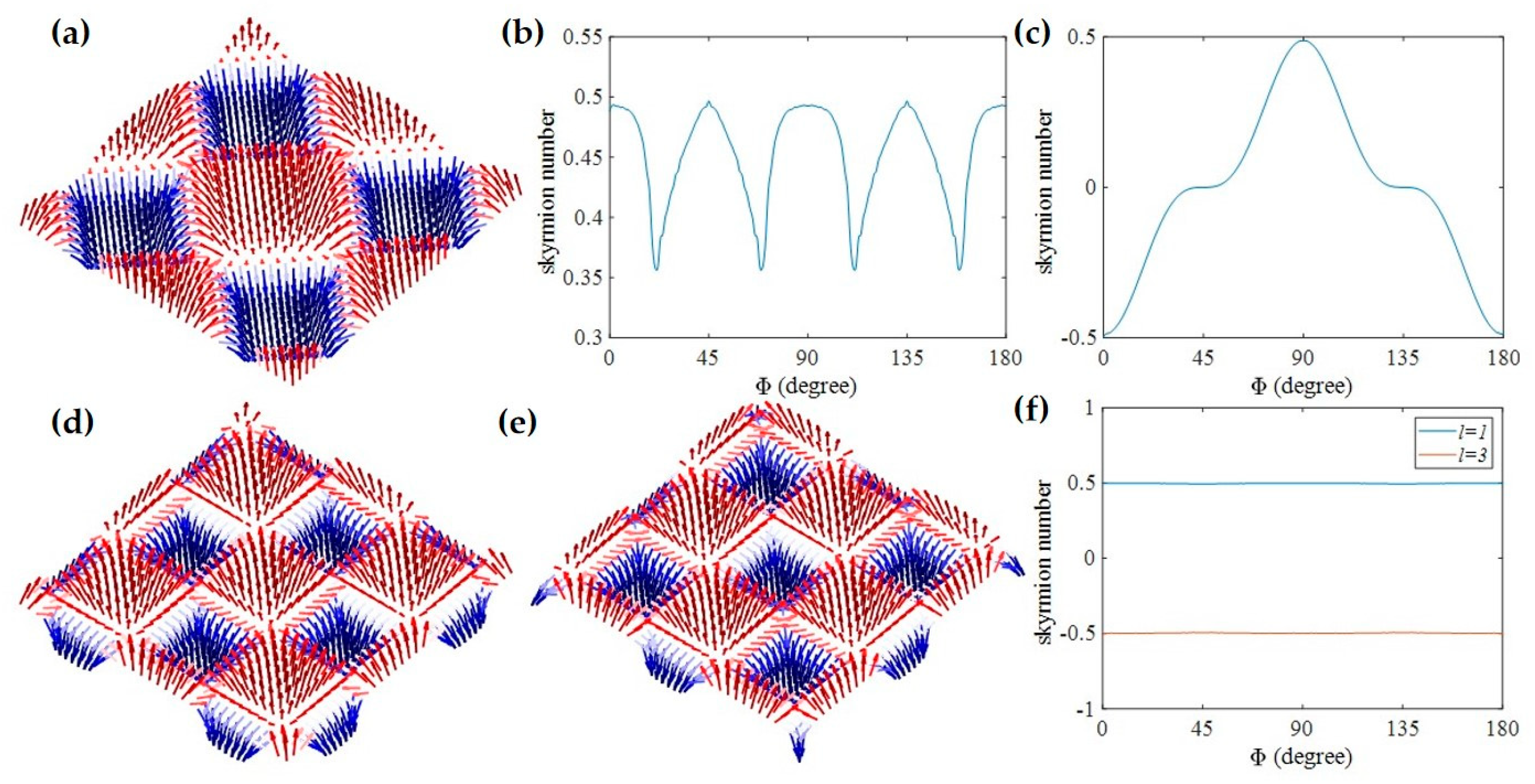 Figure 24. Simulated results of topological stability and transitions of photonic meron/skyrmion lattices at a metal/uniaxial interface [201]: (a) normalized real part of the out-of-plane electric-field component Re ( E z ) at Φ = 0° with l = 0; (b,c) evolution of the skyrmion number within the central unit cell as a function of the optical-axis orientation Φ for l = 0 and l = 2, respectively; (d,e) present the normalized out-of-plane SAM distributions S z for l = 1 and 3 at Φ = 0°. (f) Variation in the skyrmion number within the unit cell at the center of the lattices via Φ.