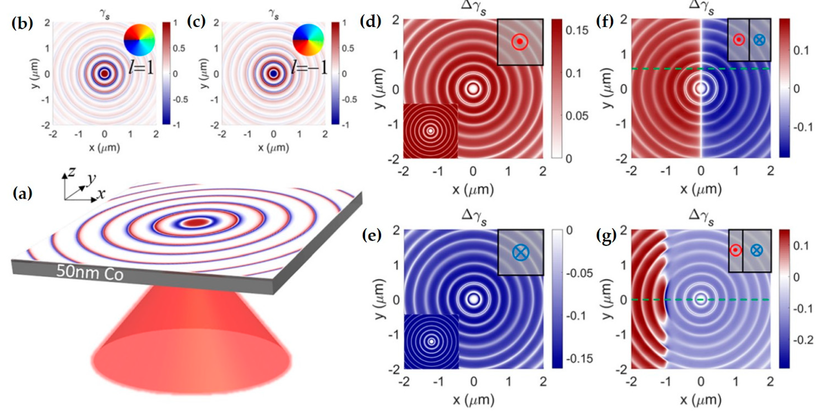 Figure 25. Optical spin–orbit coupling effect applied to magnetic domain detection [30]: (a) schematic diagram for the generation of a photonic skyrmion in a ferromagnetic material on the example of the SPP excited on a surface of a thin (50 nm) Co film by a tightly focused (NA = 1.49) radially polarized beam; (b,c) spin states of (b) positive and (c) negative skyrmions generated with l = ± 1 RP beam, respectively, with the Co magnetization in a positive z direction; (d) spatial distribution of Δ γ s for the skyrmions in (b,c). (e) The same as (f) for the magnetization oriented in negative z direction. (f,g) Spatial distributions of Δ γ s for the magnetic structure consisting of two domains with opposite magnetization orientation.
