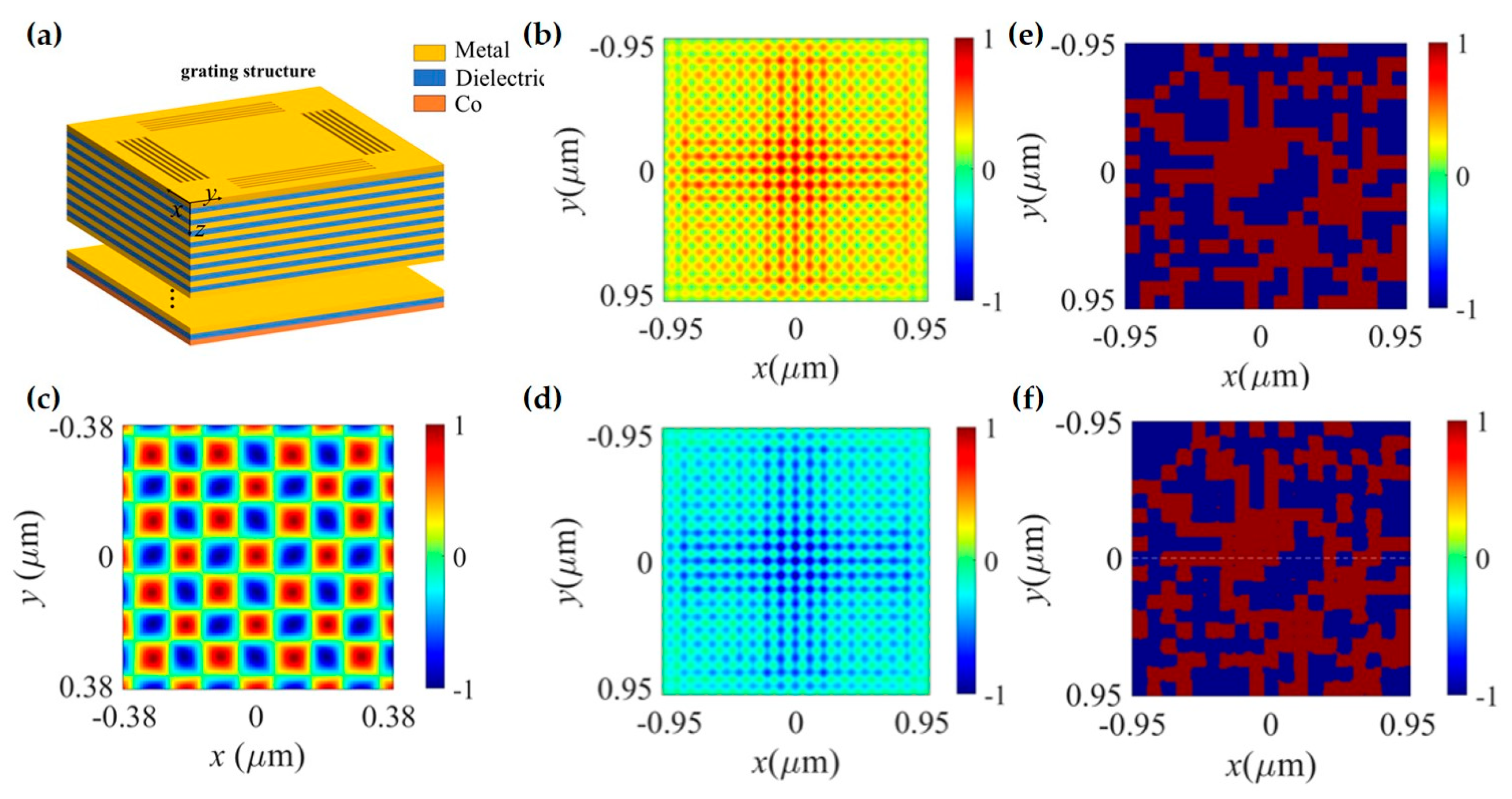 Figure 26. Optical spin meron lattice applied to deep-subwavelength magnetic domain detection. (a) Schematic diagram of the magnetic domain sensor based on a HMM; (b) out-of-plane spin component ( S z ) distribution of the optical meron spin lattice on the HMM surface, obtained by finite-difference time-domain (FDTD) simulations. The lattice unit cell size is 100 nm, exhibiting alternating “up” and “down” spin states; (c,d) the spin distribution signal ( Δ S z = T ^ ( S z L C P ) + S z R C P ) obtained by superposing the spin distributions excited by left-handed and right-handed circularly polarized light when the magnetization direction is +z and −z. Its positive or negative sign directly corresponds to the magnetization direction of the magnetic domains; (e,f) the preset random magnetic domain matrix, the experimentally detected binarized result, and the detection error distribution. The results demonstrate magnetic domain reconstruction with a resolution of 100nm and 100% accuracy under these parameters.