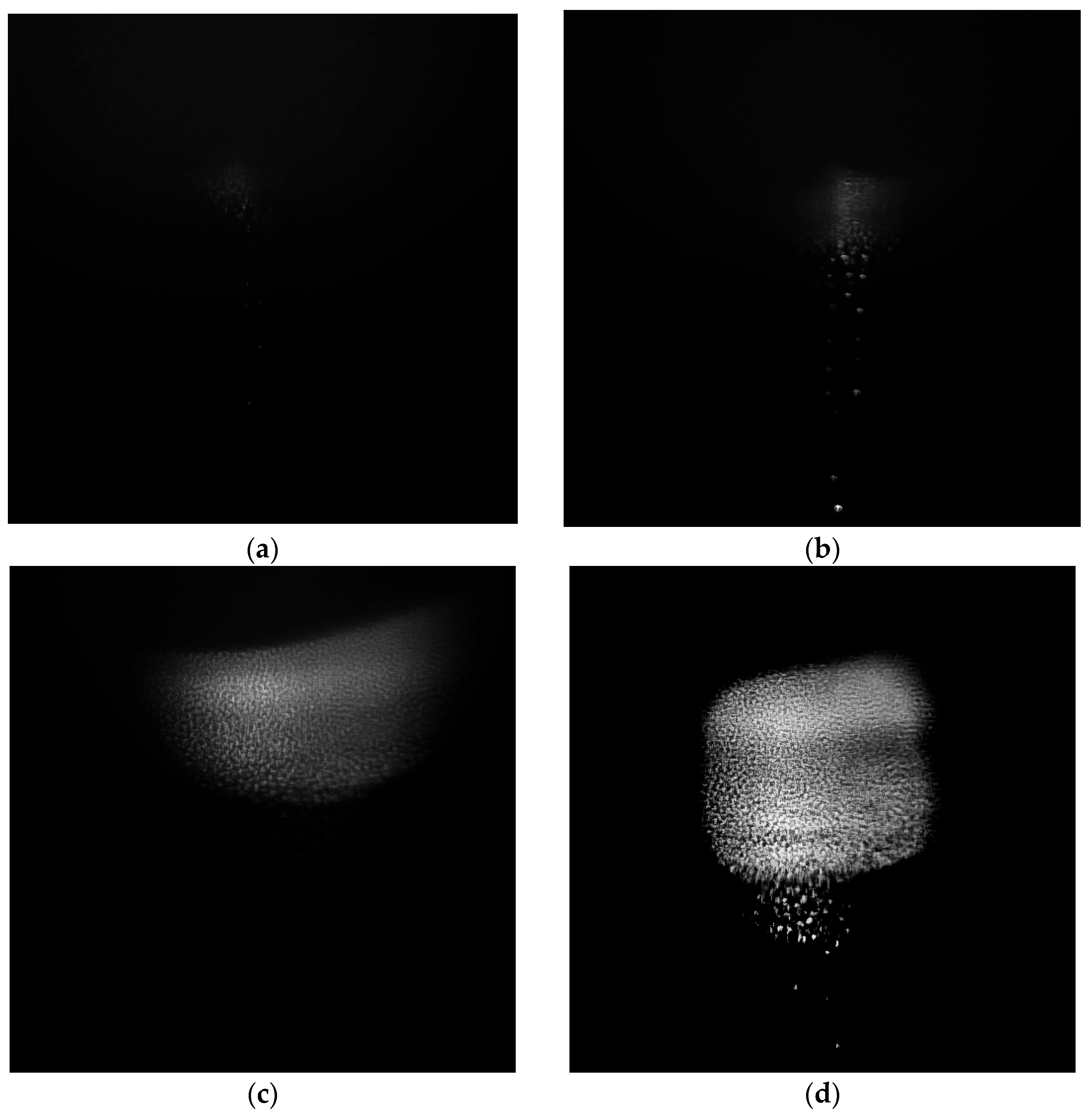 Figure 2. Video frames of 10 × 10 mm in size with the same exposure of the particle structure at different times after the discharge is turned on: (a) 2 min; (b) 5 min; (c) 7 min; (d) 10 min.
