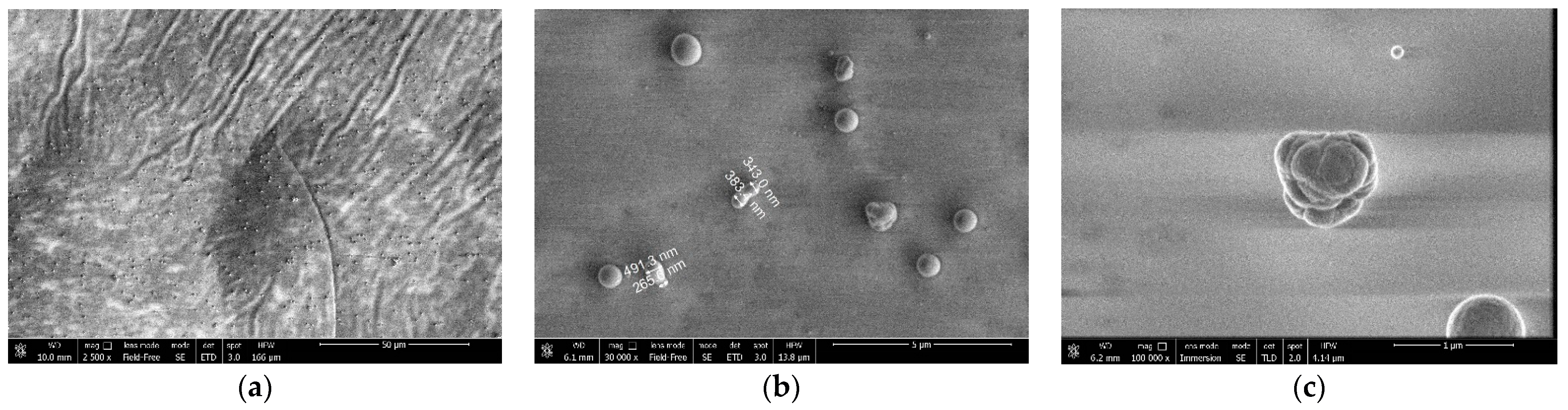 Figure 3. SEM images of nano- and micro-particles: (a) nanometer fraction (10–100 nm); (b) submicron particles (200–500 nm); (c) micron-sized particles.