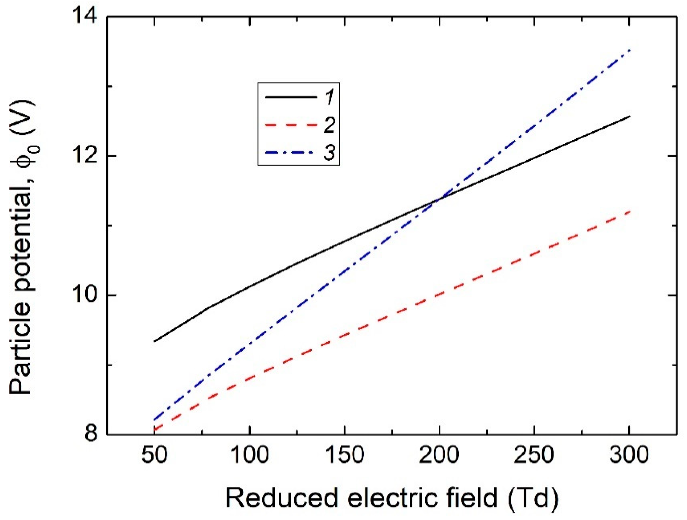 In real plasmas of DC glow discharge or RF discharge, the electron distribution function differs from the Maxwellian form due to the action of an external electric field wall (please see also Supplementary File, Section S3.3). Thus, the solution of the Boltzmann equation for the EDF in two-term approximation was used [42]. For ions, as can be seen from Table 1, the drift velocity in the gas-discharge plasma under study is comparable to the thermal velocity, so the ion distribution function (IDF) is also not Maxwellian, which must be taken into account when calculating the ion flux onto a dust particle. For the estimations, the shifted Maxwellian distribution was used [43,44,45,46,47,48,49]. Figure 5 shows the dependence of the dust particle potential ϕ0 as a function of the reduced electric field Ep/N. In calculations with Maxwell distribution functions for electrons and ions, the ion temperature was assumed to be equal to room temperature, and the electron temperature Te was determined by the average energy obtained with the EDF from the numerical solution of the Boltzmann equation. It is seen that taking into account the difference between the calculated EDF and the Maxwellian one leads to a decrease in the dust particle potential, while the addition of directed ion motion leads to an increase in the dust particle potential. Moreover, at low Ep/N, the particle surface potential is lower than in an equilibrium plasma with two Maxwellian distributions for electrons and ions, and at high Ep/N, it is higher.