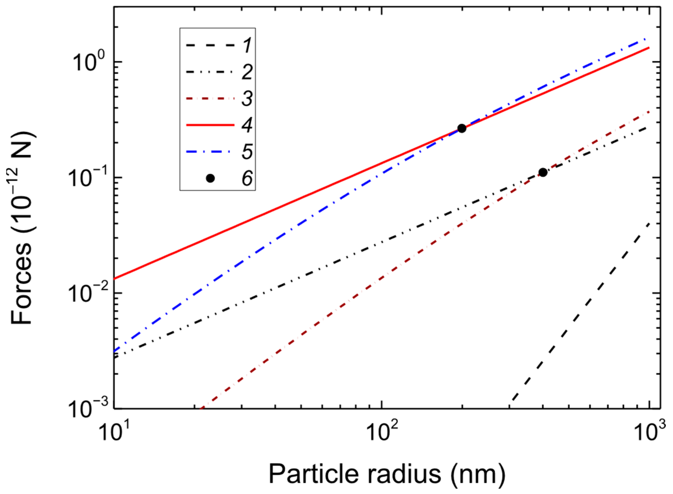 Figure 6. Dependences of the gravity force (1), the electric force (2,4), and the ion drag force (3,5) in the normal (2,3) and narrowed parts (4,5) of the tube on the particle radius. The black circles (6) indicate the intersection points of the ion drag force and the electric force.