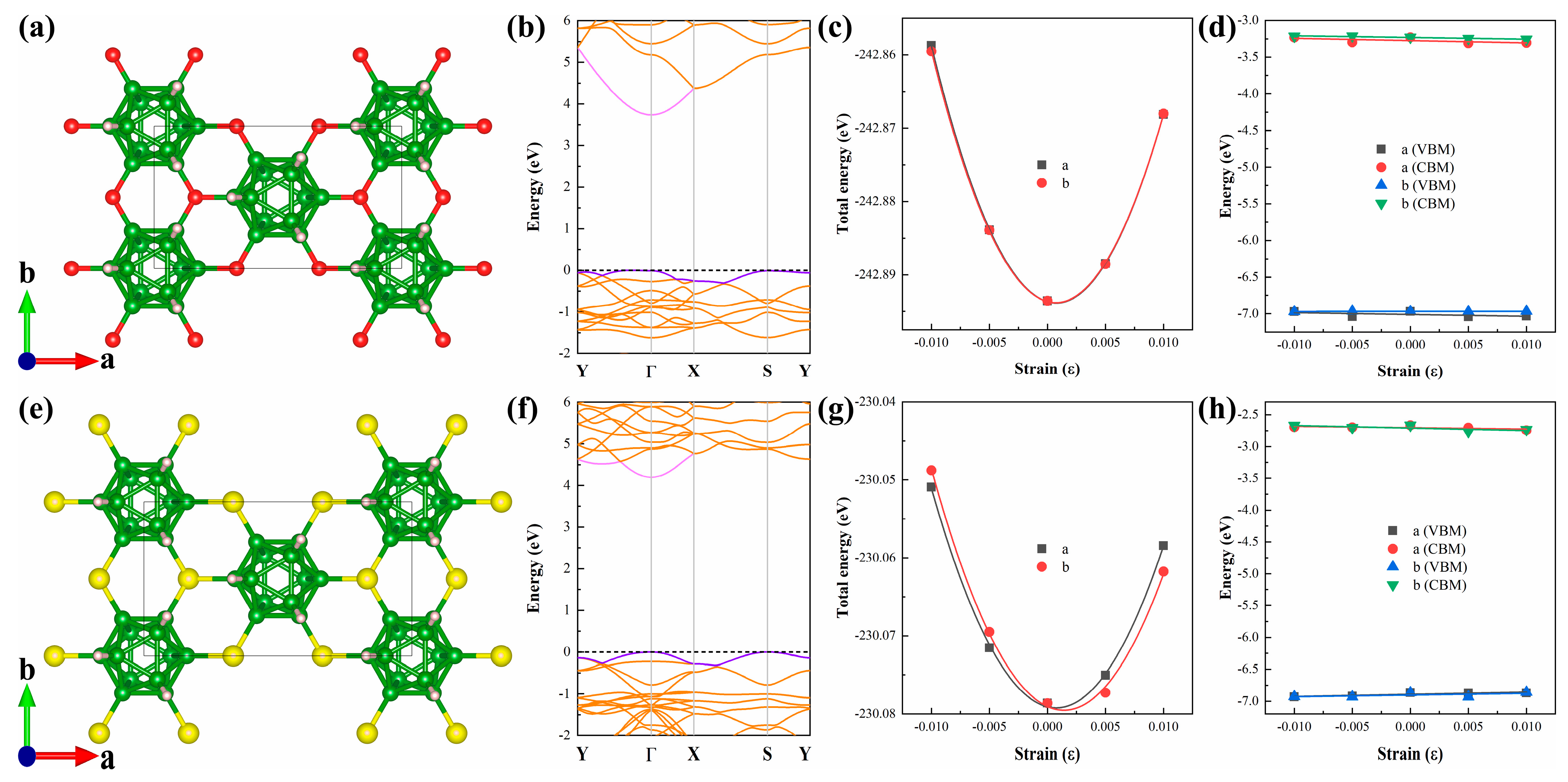 - Yuan, J.; Yu, N.; Xue, K.; Miao, X. Ideal Strength and Elastic Instability in Single-Layer 8-Pmmn Borophene. RSC Adv. 2017, 7, 8654–8660. [Google Scholar] [CrossRef]