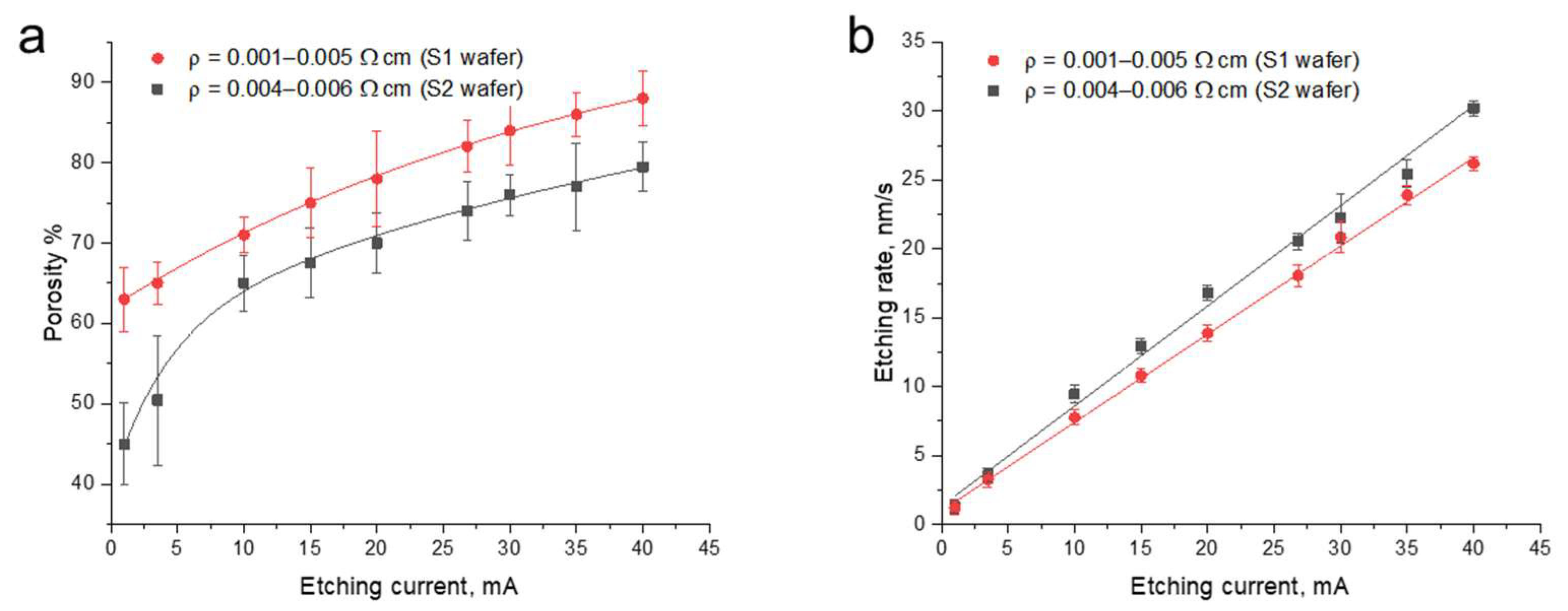 - Foss, S.E.; Kan, P.Y.Y.; Finstad, T.G. Single Beam Determination of Porosity and Etch Rate in Situ During Etching of Porous Silicon. J. Appl. Phys. 2005, 97, 114909. [Google Scholar] [CrossRef]