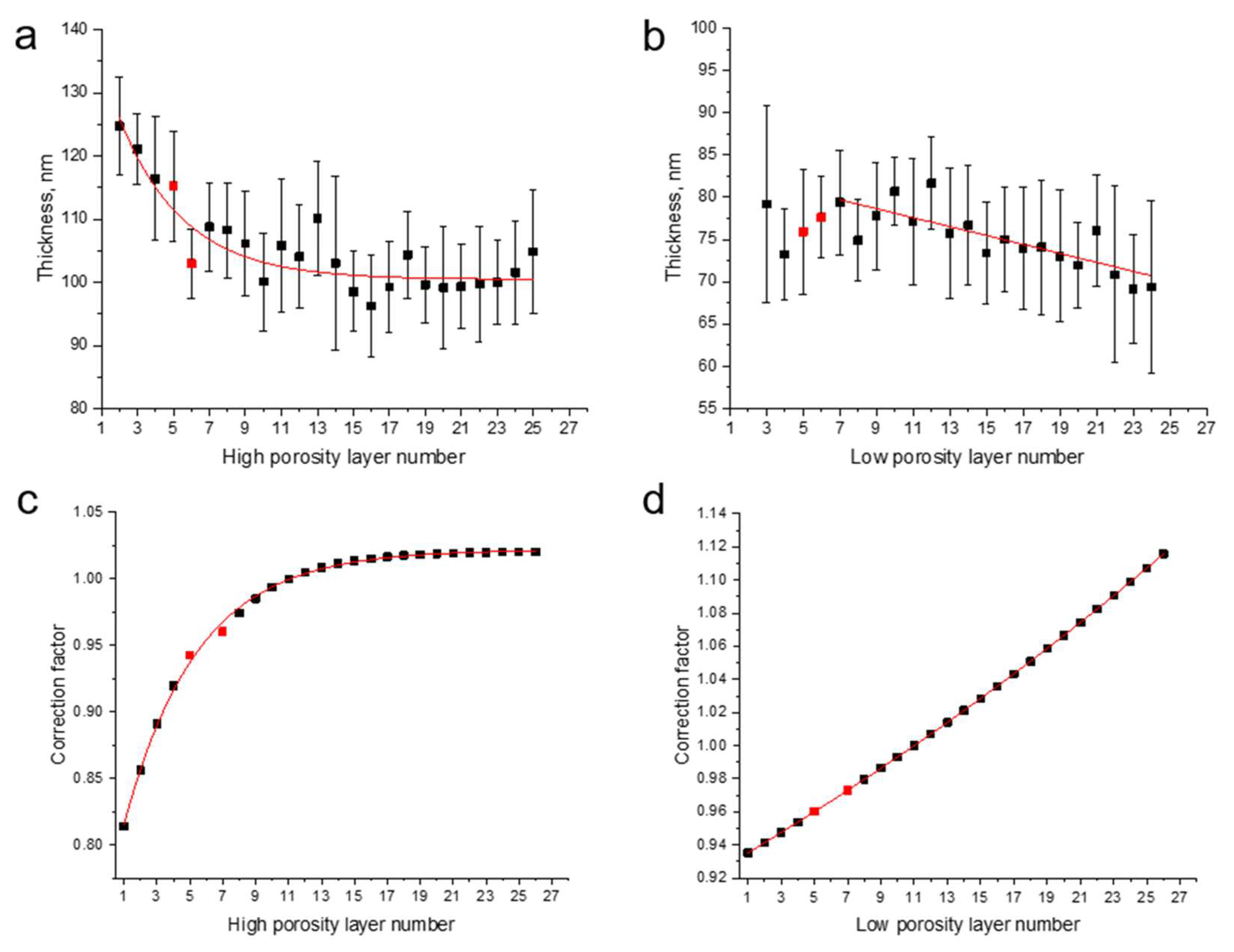- Villanueva, J.L.M.; Huanca, D.R.; Oliveira, A.F. Thickness and Porosity Characterization in Porous Silicon Photonic Crystals: The Etch-Stop Effect. Mater. Chem. Phys. 2023, 307, 128070. [Google Scholar] [CrossRef]